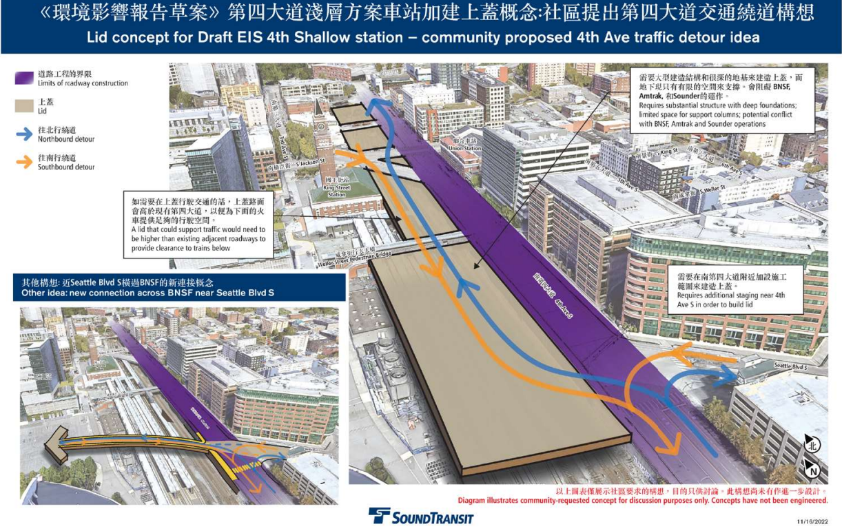 Sound Transit has also developed more ideas around how construction would go down should Fourth Avenue, which is major thoroughfare for buses and vehicle traffic, be torn up for extended periods during station construction. One concept would add a lid to the railyard on the west side of Fourth Avenue, but Sound Transit has deemed it impractical and likely to conflict with BNSF and Sounder rail operations.