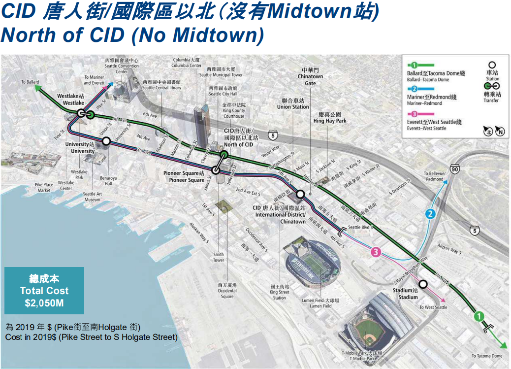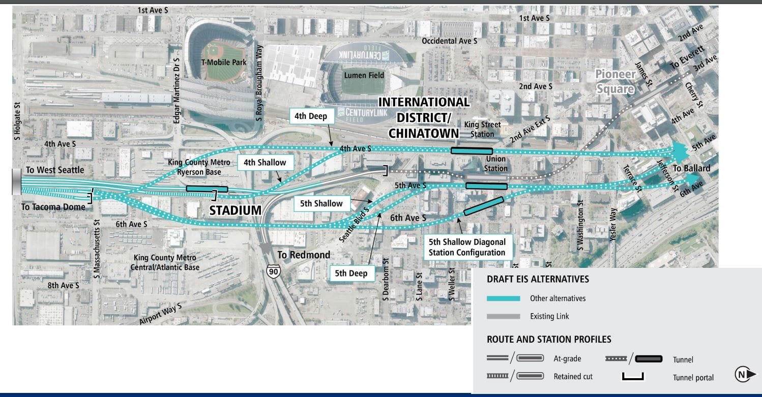 Skipping Chinatown and doing a “North of CID” station alternative leaves much to be desired. Such a station is too far from Sounder, Amtrak, and the streetcar. Sound Transit pegs the transfer at 12 minutes to Sounder or just over 3 minutes to transfer to the existing Pioneer Square Station to connect between light rail lines. The station would be about 103 feet deep for people headed to the surface. It’s not clear if there’d be separate elevators for those headed to make the light rail transfer.