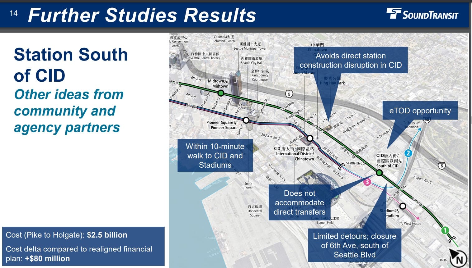Likewise, skipping Chinatown and Midtown doesn’t seem tenable either since it does not meet ST3’s promise to voters or usable service quality. There needs to be a south junction station where riders can make convenient transfers between transit lines. The new Westlake Station offers the north junction, but transfers might not be quick or pretty considering how deep it will be. The CID Station was the great hope for a south junction to have an excellent transfer point.