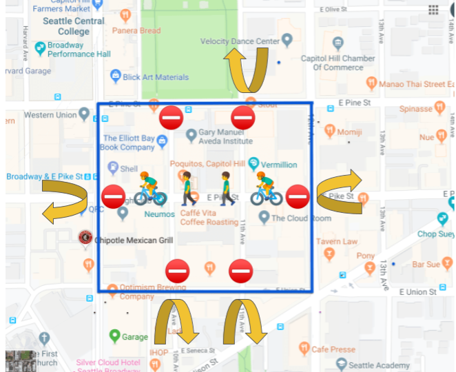 Before we get ahead of ourselves, here’s how the superille that Councilmember Mosqueda has suggested might work. The City would install traffic diverters on the interior streets of the rectangle outlined in blue and would generally prohibit motorists from traveling through the middle. Automobile traffic would still be allowed on the peripheral streets, in this case E Pine Street, 12th Avenue, E Union Street, and Broadway. Ridehailing pick-up and drop-off zones could be sited along these peripheral streets. Meanwhile people walking, biking, scooting, and rolling would be allow to permeate the superille at will and have a grand old time sans car traffic bearing down on them. See the diagram below for a visualization.