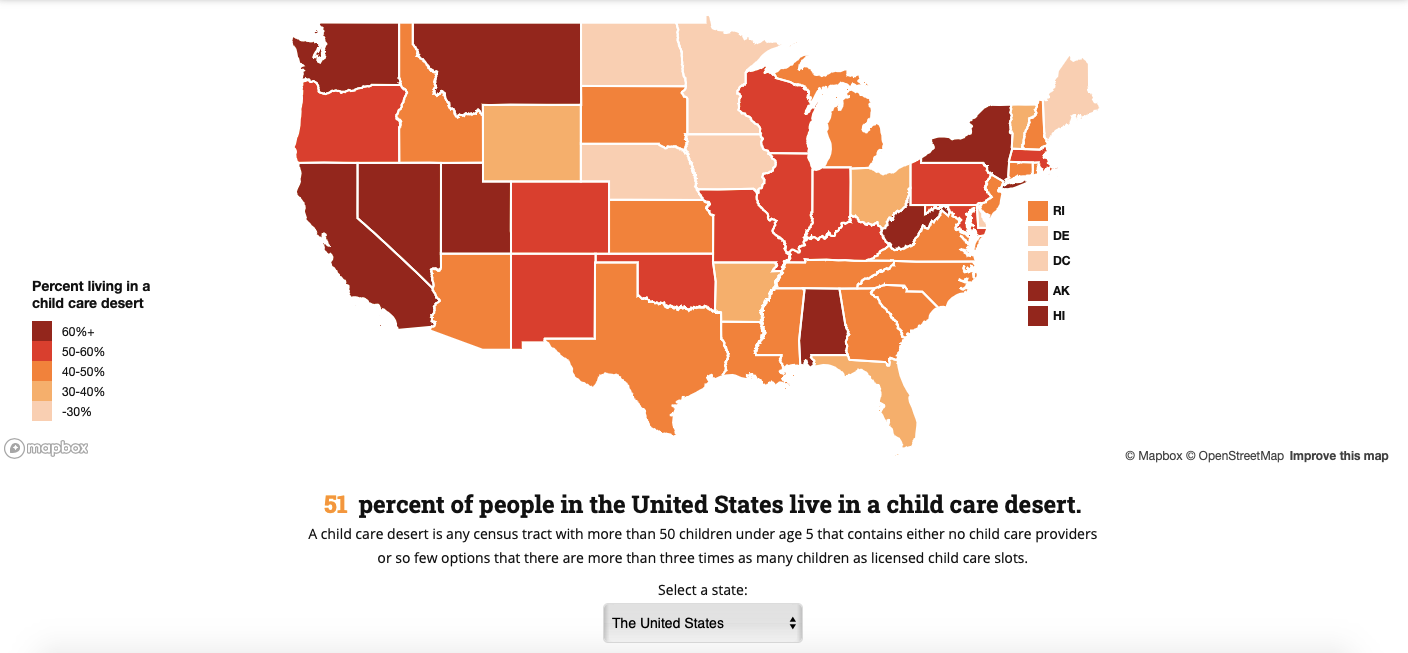 In fact, according to the Center for American Progress, roughly 51% of Americans live in childcare deserts, identified as “any census tract with more than 50 children under age 5 that contains either no childcare providers or so few options that there are more than three times as many children as licensed childcare slots.”