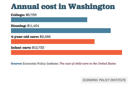 In no small part because of the tight squeeze on childcare services, Washington ranks ninth nationally in child care costs. The Economic Policy Institute estimates that Washingtonians can expect to pay more for childcare expenses than many other major life costs, including in-state university tuition. For dual income couples, the high expense of childcare is often burdensome, but for single parents it can be prohibitive, leading to difficult and conflicting choices for family well-being.