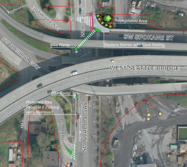 This $300K project at the gateway between West Seattle and Downtown is perhaps most notable for a feature that would be pretty unique in Seattle: a dedicated bike signal that would function on a diagonal across Harbor Ave and Spokane St. Other improvements would attempt to improve visibility and sight lines and extend curbs to square them off. This is one of the most heavily trafficked areas for biking to and from West Seattle. Some “bike ramps” would connect at Avalon but a protected bike lane would require the removal of parking so that will likely go through further community process.