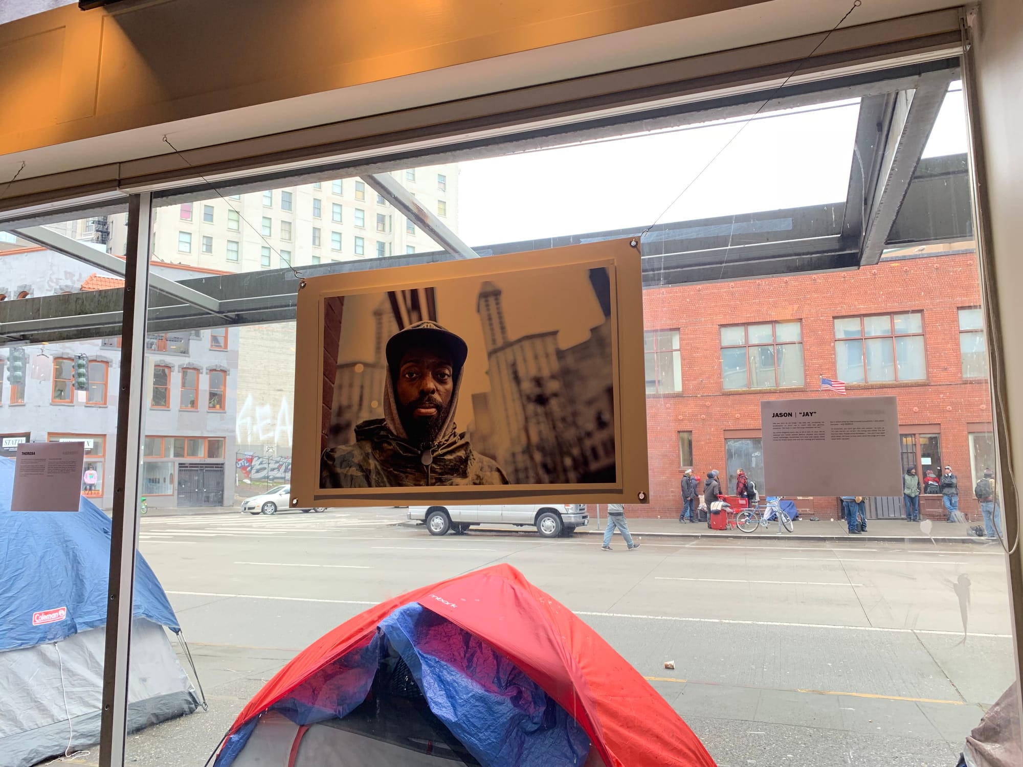 It was time for the outdoor viewing for Home Now, an innovative photography exhibit on display at the Impact Hub in Pioneer Square. Rachelle Mee-Chapman had prepared a tent with coffee and donuts to share, and volunteers were already deep into serving the long line of people that wound around the corner of Second Avenue and South Washington Street.