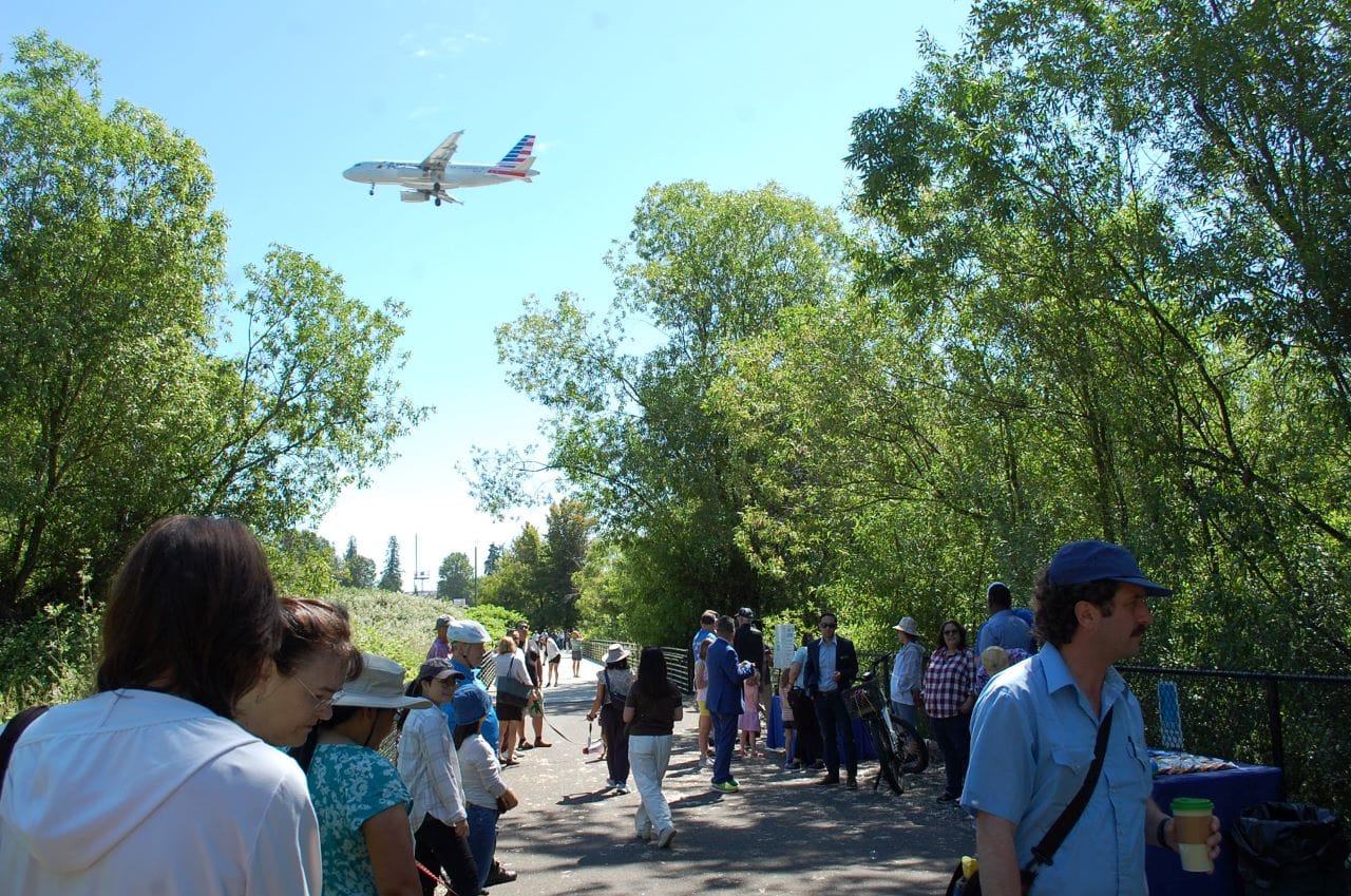 As an Alaska Airlines jet shrieked nearby on its final approach to the airport, SeaTac city council member Peter Kwon talked about the importance of the Lake to Sound Trail. “We have a need for bike lanes, especially in our communities near the airport impacted by noise, pollution, and traffic,” Kwon said. “We really need natural open spaces – it’s an even higher priority here than in other areas.”