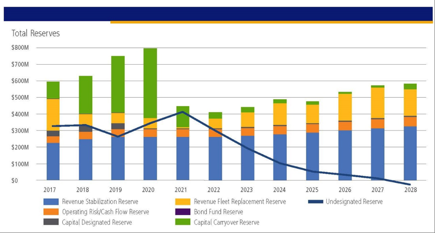 The budget may be shored up for now by delaying capital expenditures (including RapidRide R, half of RapidRide J, and RapidRide K between Kirkland and Bellevue), making one-time adjustments, and dipping into rainy day funds, but that could become problematic in future budgets if the agency is forced to further draw down on reserve revenues. In a report last month, staff warned that if more stable sources of funding are not obtained in the next few years, the agency could be forced to make further cuts by 2025. That could mean cutting back service an additional 13%.