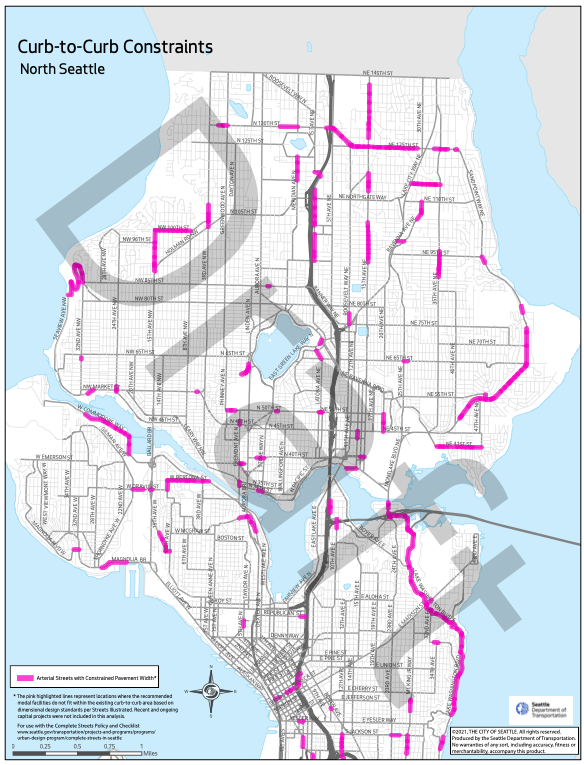 Where this most matters, according to SDOT, is at spots in the street network where there isn’t enough room to physically fit everything. Trying to fit a transit lane, a freight lane, and a protected bike lane onto one block, there might just not be enough space to get everything in there. SDOT has mapped these “deficient” streets and found that there are 440 arterial blocks, or around 8% of the 5,269 blocks with planned modal networks, where the roadway width is too narrow. SDOT has now released maps of all these segments in a newly released white paper on their proposed integration policy, and these maps underscore just how separate the fact of physical constraints is from the very political issue of where the City prioritizes certain modes.