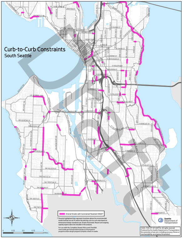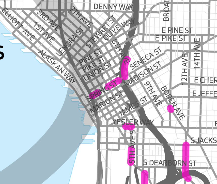 In Downtown Seattle, for example, where jostling over street space can be at its most intense, almost no streets are highlighted as being physically constrained: a few stretches of Seneca Street and a swath of Hubbell Place next to Freeway Park, envisioned as having a protected bike lane in the BMP. 4th Avenue, where Mayor Jenny Durkan held off on green lighting a protected bike lane that was ready to be built when she took office, doesn’t register.
