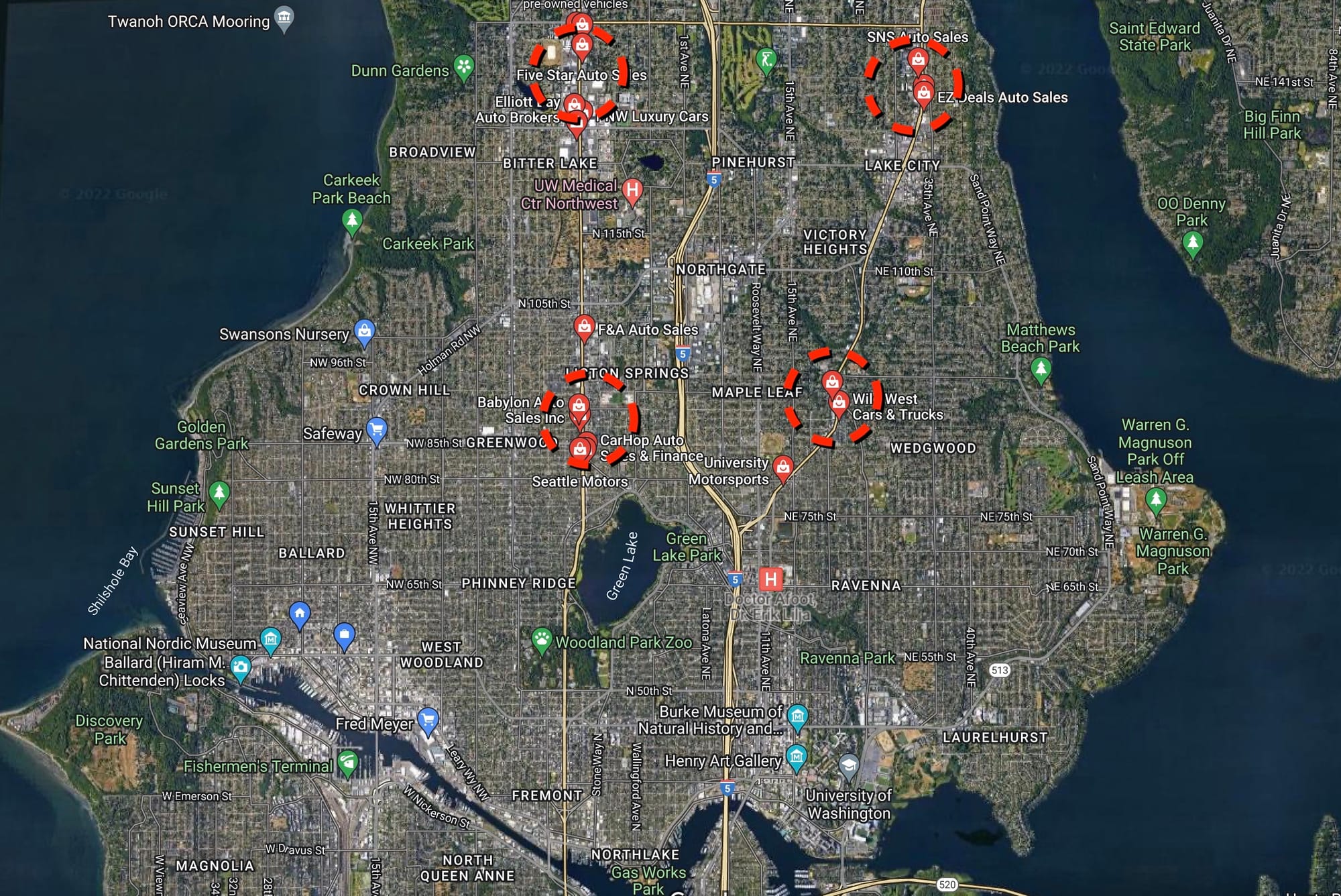 A simple search for car dealerships in North Seattle shows four major hubs. Along Lake City Way, there is a cluster located around NE 89th Street and Ravenna Avenue with another north of Lake City around 135th Street. There are similar clusters on Aurora Avenue: one at N 85th Street and another among the large shopping centers going from Bitter Lake to the city line.