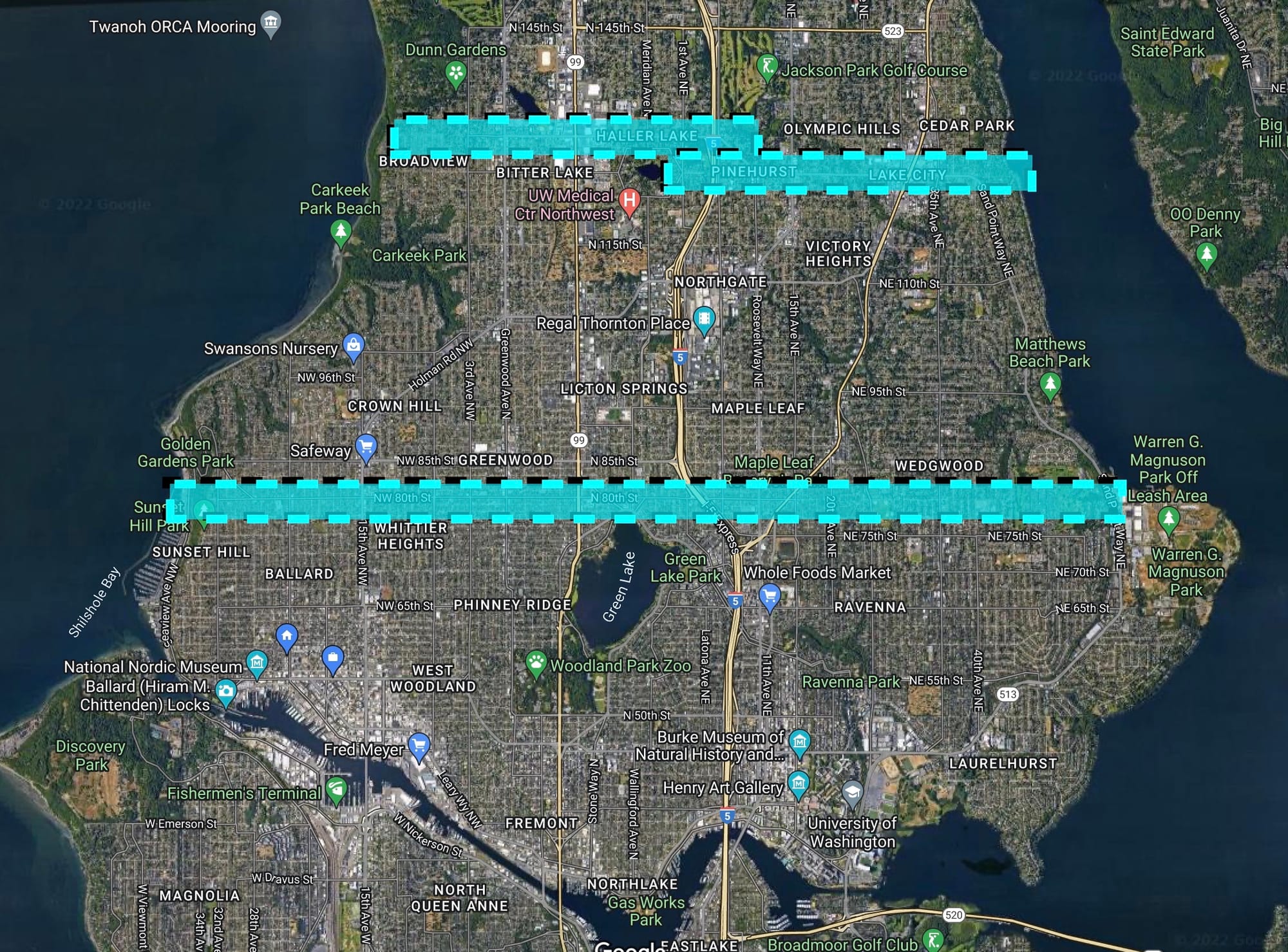 But the Main Street idea kept returning. Maybe it’s time to found a new Main Street across North Seattle. Seattle’s north-south orientation already puts a lot of development along certain avenues, so let’s try something different.