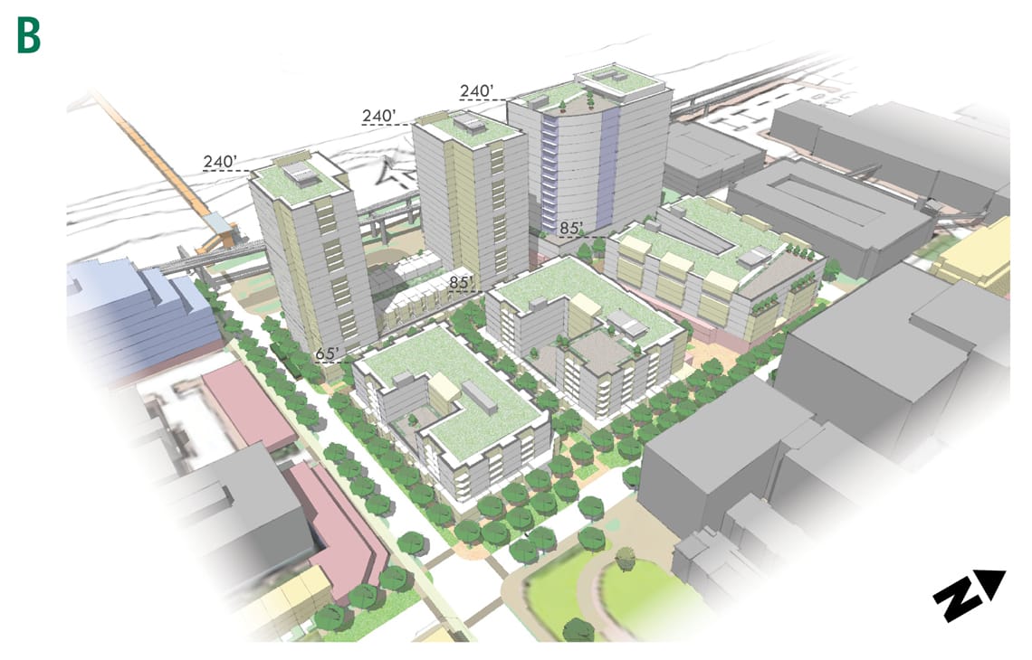 While 11-story towers would reach new heights for Northgate, the 2019 Mandatory Housing Affordability (MHA) rezones of the neighborhood did grant 240-foot zoning allowing towers up to 24 stories tall immediately east of the station in a large County-owned lot. There was hope this would lead to a large mixed-income highrise development opening shortly after the station opened in 2021. That didn’t come to pass, however.