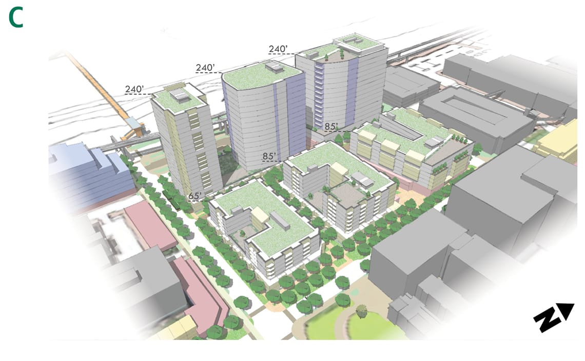 It’s not clear why the eastern site (phase one) is rendered well below even what existing zoning allows at 85 feet, 40 feet below 125-foot zoning and 60 feet below the proposed MHA height limit to 145 feet, perhaps within the year. This may have to do with a restrictive floor area ratio (FAR) hindering proposals–existing NC3-125 has a FAR of 6, which seems to just encourage shorter bread-loaf buildings rather than high-rise towers, which struggle to utilitze the whole site and recoup their higher construction cost per square foot. Luckily the MHA process aims to raise the FAR to 7 in the new NC3-145 zone. Moreover a Station Overlay District could be sped up to ensure the site’s potential isn’t squandered and the sites get 240-foot zoning as soon as possible.