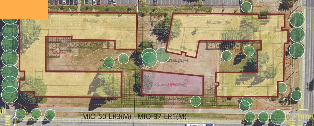Numbers appear to still be up in the air, but mall development — use the plan set above to match plans to plots — according to the latest data as of writing this article and submitted to Seattle permit portal so far includes…M1: A seven-story 232-unit mixed use apartment building with 13 live/work units and 414 parking spots. In planning/permitting processM2: A nine-story 222-unit mixed use apartment building with 616 parking spots. (A slightly older document had it at an eight-story 230-unit mixed use apartment building with 580 parking spots, 246 bicycle parking stalls, and 23,787 sq ft for retail) In planning/permitting processM3: A seven-story 181-unit mixed use apartment building. (A slightly older document had it at a 186-unit seven-story mixed apartment building with 10 parking spots and 5,799 square feet of retail) In planning/permitting process— A 6/8/21 large sign indicates that M2 and M3, which will be connected, will have a combined 416 units and 580 parking spots.M4: An eight-story 280-unit mixed use apartment building with 14 live/work units and 317 parking spots. In planning/permitting processH2: A seven-story hotel with 173 keys. In planning/permitting processO3: A nine-story office building with ground floor retail and a shared two-level parking garage with O5. In planning/permitting processO5: An eight-story office building with ground floor retail and a shared two-level parking garage with O3. In planning/permitting process