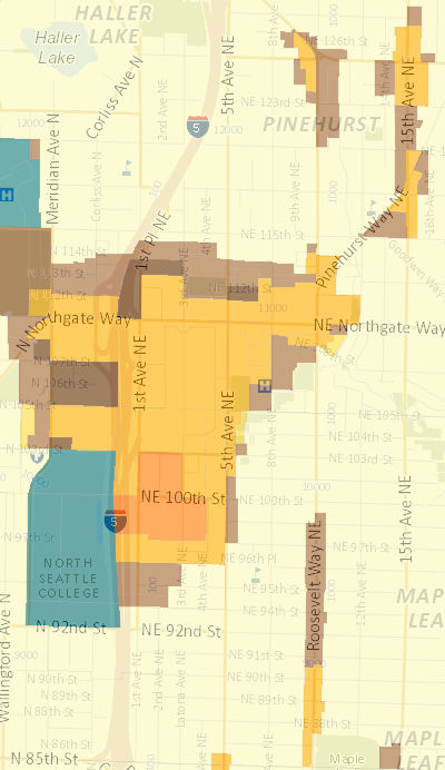 Long anchored to the first of its kind Northgate Mall, the area is warping with the old mall property. The diffuse neighborhood has long been standard suburbia defined by single-family homes and strip malls. Changes coming to the Simon-owned mall property signal the start of a possible transformation of Northgate with dense residential and commercial development. The introduction of light rail service and a new transit center offer many transit-oriented development opportunities, albeit the development is being artificially limited by neighboring I-5. Upzoning and the significant publicly owned lands in the area will provide an influx of both market-rate and affordable housing options.