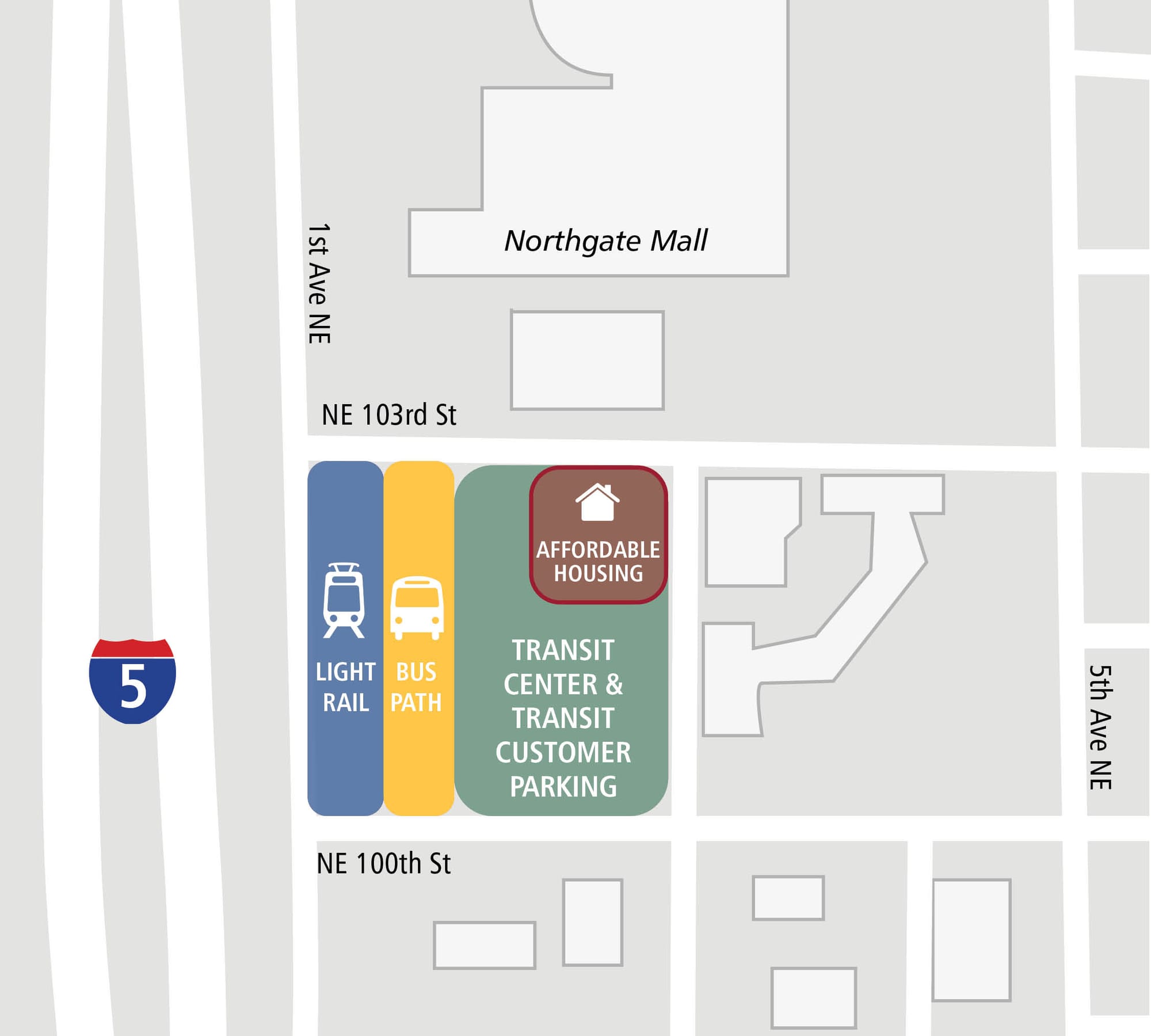 - 11057 8th Ave NE: A seven-story 89-unit apartment building with a child care center, 28 parking spaces, and 102 bicycle parking stalls. In permitting process