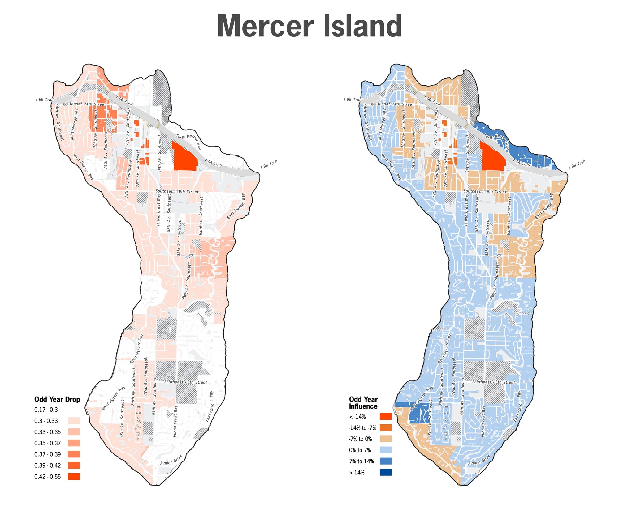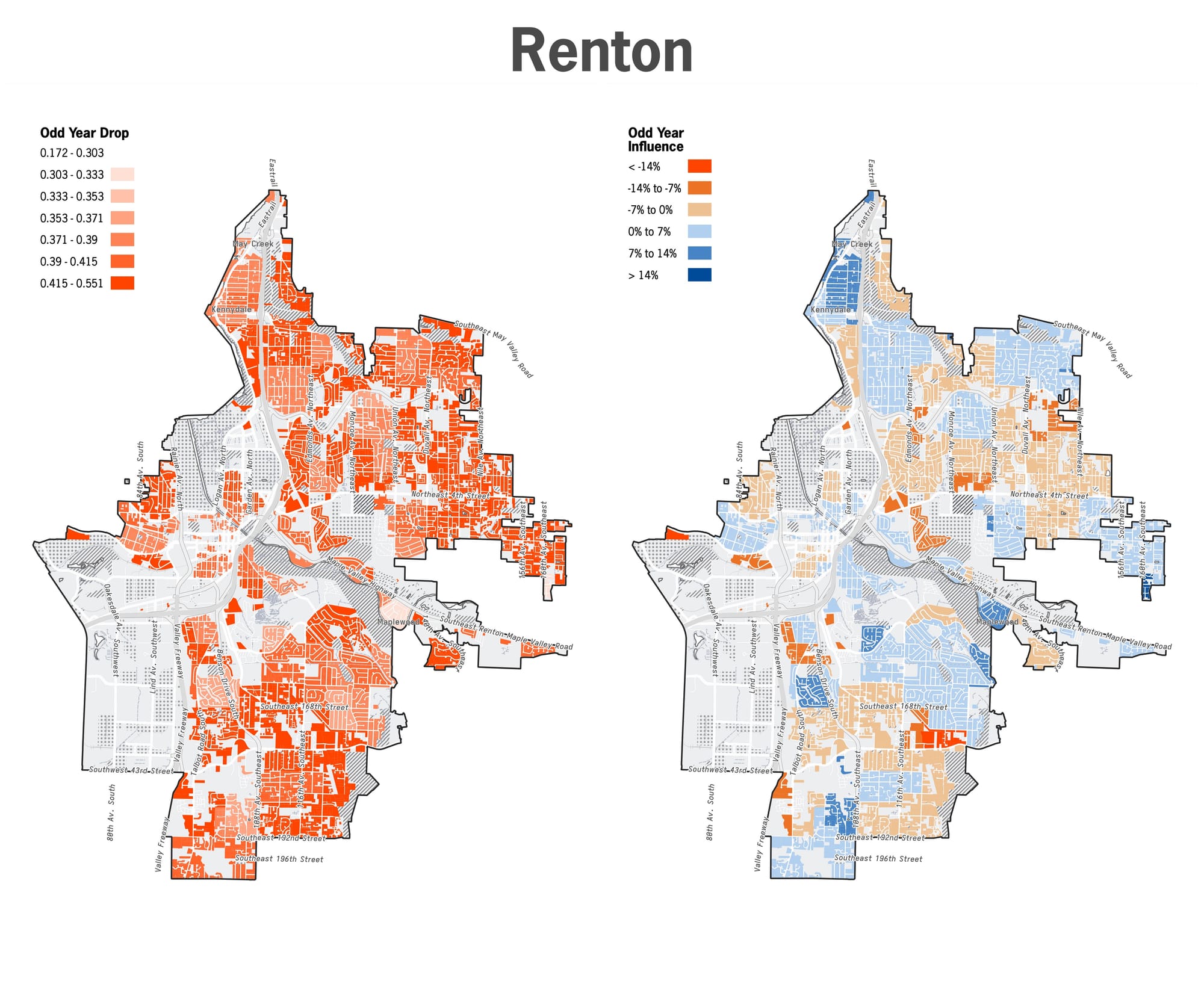 The pattern is consistent all over the county, as shown in the maps below which illustrate the shift in the electorates of Shoreline, Renton, Mercer Island, and Bellevue. Turnout cratering in lower-income and tenant-heavy areas and holding steady in the wealthiest corners of the county likely makes it easier for certain kinds of candidates to win and for certain issues to gain salience and attention.