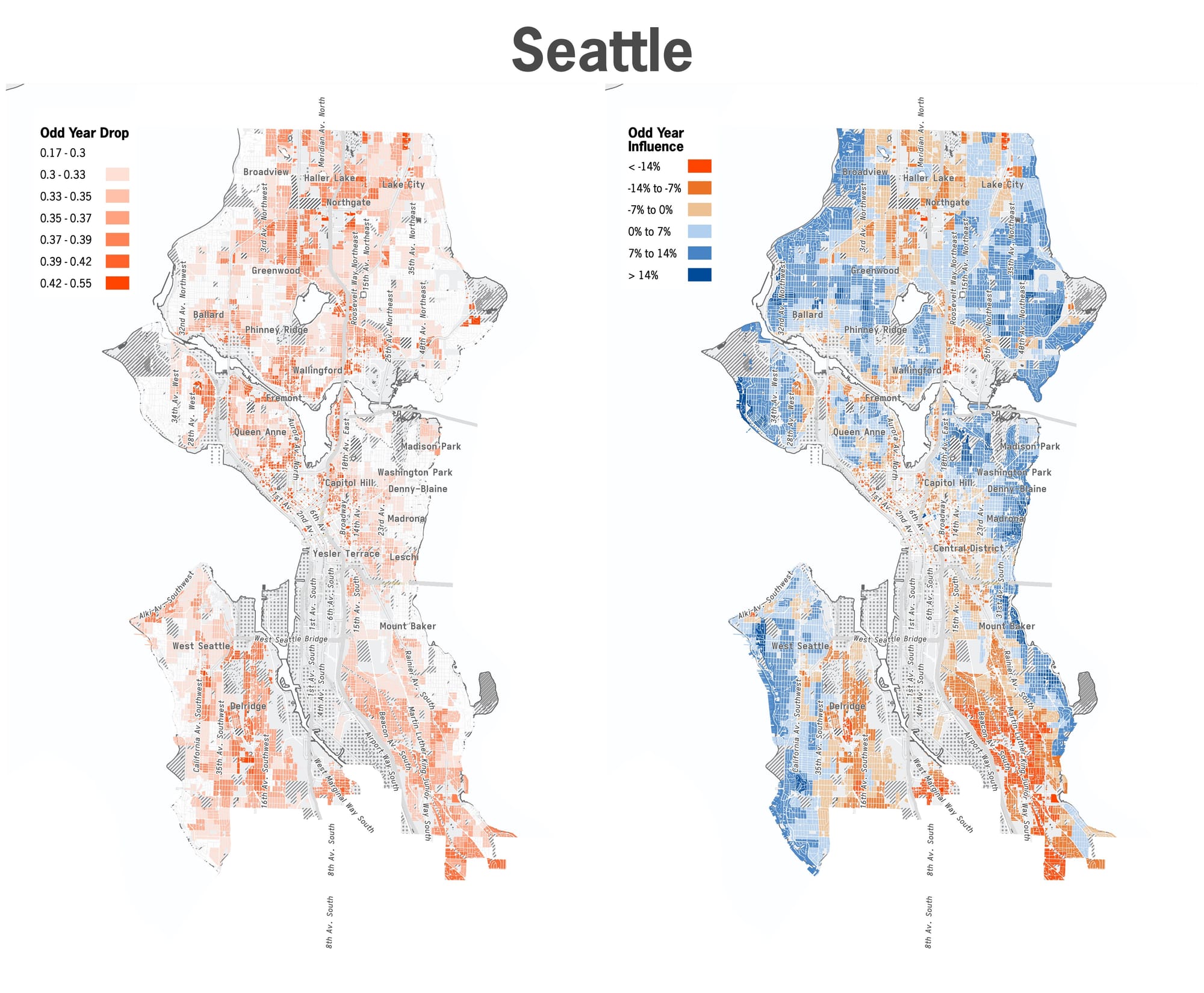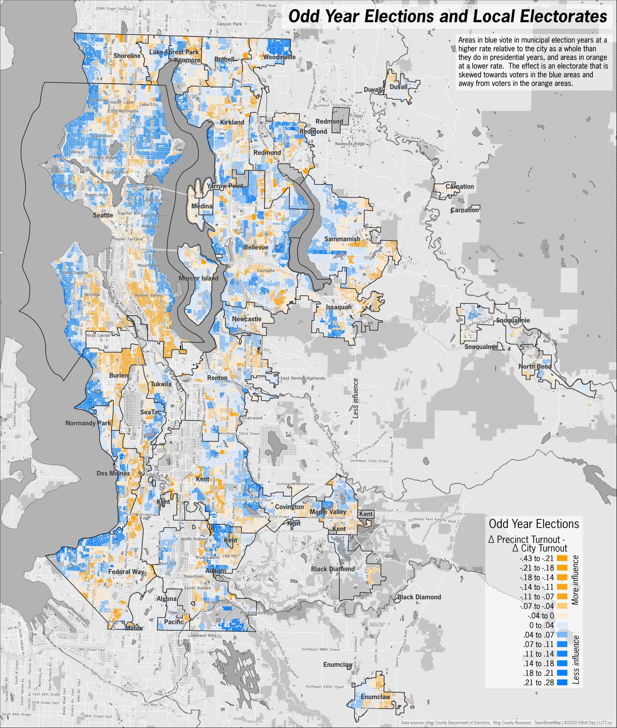 Elliott Day, who was campaign manager for Mohamed Egal’s successful SeaTac City Council campaign last year, put together some maps and analysis which show that the odd-year hit to turnout is not uniform across the board. Wealthy neighborhoods see a much smaller drop off all across King County, which means their influence goes up.