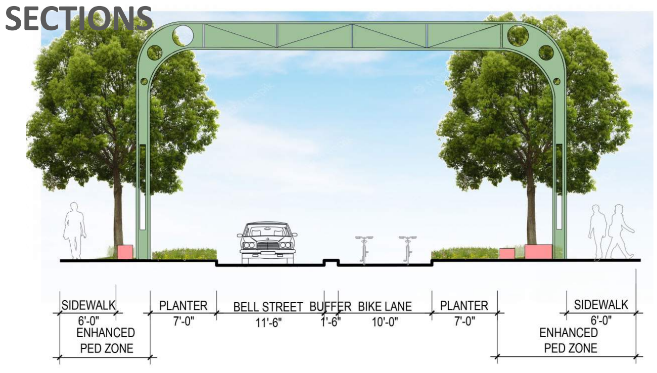 The rest of the space would be dedicated to pedestrians, but there are some big hurdles standing in the way of making the most of the space. With only around $3 million to spend, the project team is trying to leave as much of the existing curb on Bell Street in place as possible — a curb designed several years ago that includes bump-outs at the intersections to accommodate parked cars mid-block. That means after the two-way bike lane is accommodated on the block, the amount of extra space for pedestrians is mostly limited to an expanded sidewalk along the north side of the street.