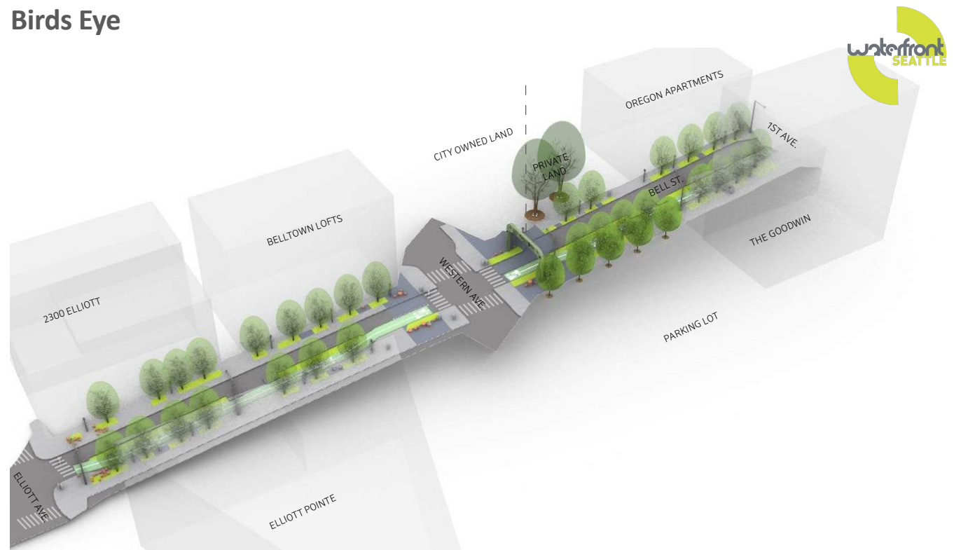 Seattle’s special department focused on the revamp of the central waterfront has released a proposed concept for how to remake a two-block stretch of Bell Street, one of the final projects in the $781 million program expected to wrap up by 2025. The project, which started design well after the main waterfront corridor was under construction and other related projects on the corridor were getting their ribbon-cutting, has long been intended to better connect one of Seattle’s densest residential neighborhoods with the newly remade waterfront.