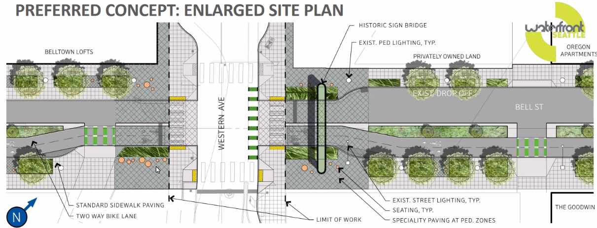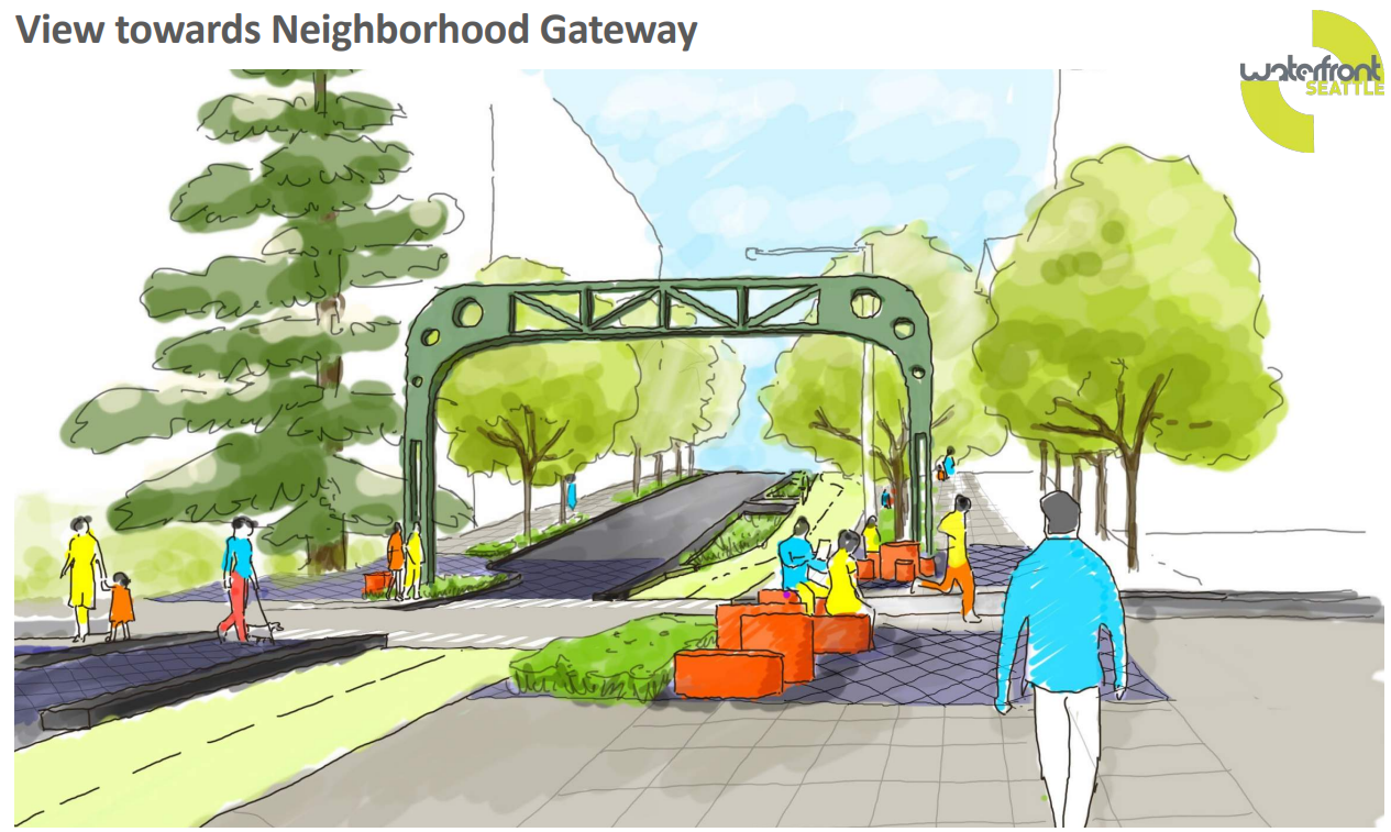 The proposal now includes some vague seat-like objects, shown being used as seats in the renderings that have been created so far, but Geter emphasized it was still too early to say exactly what those areas will actually look like. The entire Belltown end of the waterfront project has very few of the gathering spots planned in contrast with areas further south like the Overlook Walk taking shape near Pike Place Market, for example. In fact, pedestrian traffic up through Belltown is so much of an afterthought that the new Elliott Way sidewalks, which opened in April, don’t come with any pedestrian wayfinding to help people find their way to high traffic areas like Seattle Center or the Market.