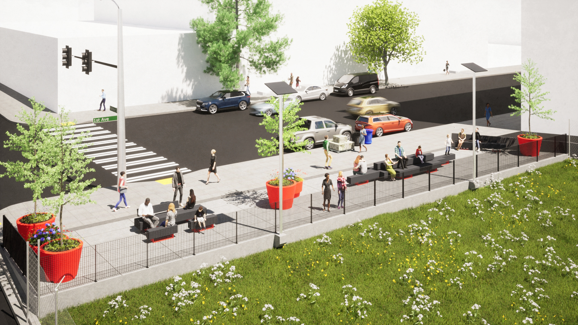 In contrast to the Office of the Waterfront removing seating from their plans for Bell Street, the Seattle Department of Transportation is working on an immediate plan to add seating and space for gathering nearby, at what is being called the “front porch” at First Avenue and Battery Street, one block north of Bell Street. Funded by a $500,000 allocation by Councilmember Andrew Lewis in 2021, the project is an attempt to activate at least a small portion of the Battery Street portal property where the Alaskan Way Viaduct previously transitioned to an underground tunnel. Most of the land is being held as a potential site for a downtown public school, which shows no signs of moving forward any time soon.