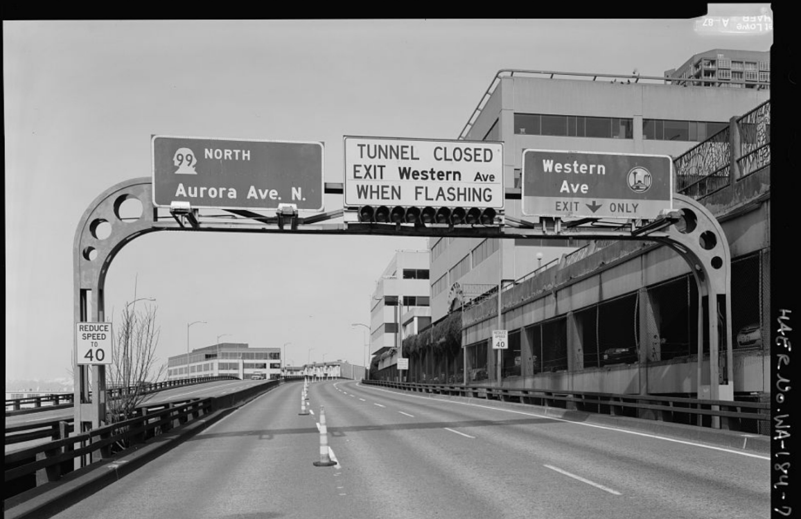 Either option currently on the table is being designed around one salvaged highway sign from the Alaskan Way Viaduct, which formerly entered a tunnel near the site. Similar to plans that added a piece of the “ramps to nowhere” into the final piece of the UW Arboretum after the Highway 520 bridge project is completed, the sign is intended to be a nod to the city’s history of civic activism. Of course, the reclaimed feature could just as easily be seen as evidence that the city isn’t ready to let go of its car-dependent past.