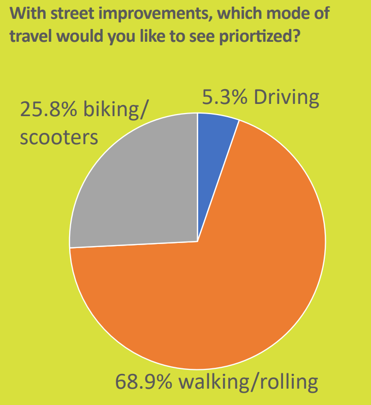 In late January and early February, the city conducted an online survey of the project that received over 500 responses. Over 94% of respondents said that improvements to the street should prioritize people walking and rolling or biking and using scooters, with just over 5% saying that improvements should prioritize people who drive. Many of the comments submitted by respondents requested that the street become fully closed to through traffic so it could become pedestrian space. “The safe street portion of bell street is much better than this section, and it would be even better for biking if it was closed to cars,” one person wrote. “The biggest improvement that could be made is to close it off to cars and replace the street with tables and spaces for people to hangout,” another wrote.