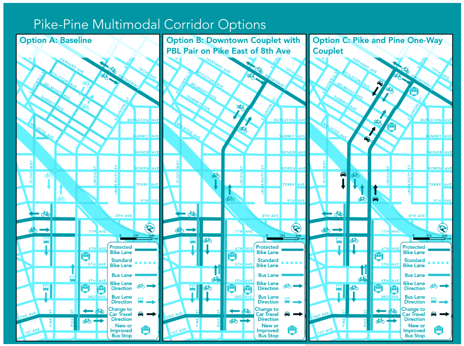 Pretty simple, though my sense from talking to business owners and people beginning outreach on Pike/Pine bike lanes in Capitol Hill is that the Broadway cycle track has many business owners opposed to another two-way cycletrack on the Hill. A couplet could be more palatable, which brings us Option C.