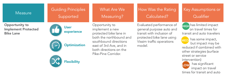 The proposal lays out two possibilities for east-west bike lanes between Downtown and Capitol Hill. Both Pike and Pine have bus lanes now in Downtown that disappear around the freeway. No concept proposes extending those, so it’s just bike lanes, general purpose lanes, and parking lanes that are jostling for space here.