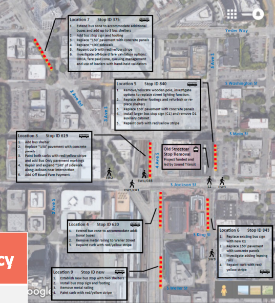 - Improvements around bus stops and key pedestrian corridors International District/Chinatown Station. This includes replacing the terminus of the old Waterfront Streetcar line at 5th Ave S and S Jackson St.