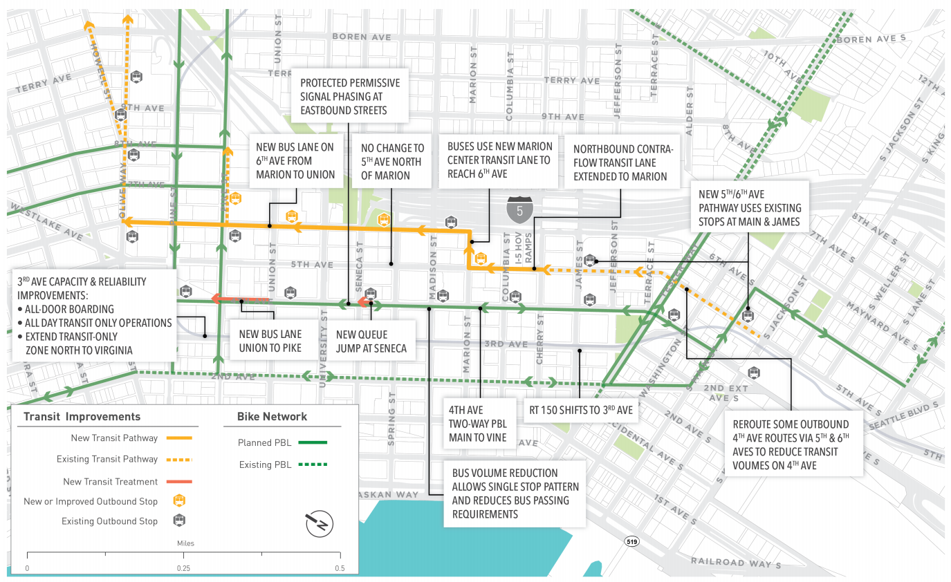 They were there to get a recap of the decisions that had been finalized, without them, during those nine months as Seattle’s new mayor assumed control and the Washington State Convention Center expansion, the pivot point on which so many transportation challenges downtown in the next few years hinge upon, was approved by the city council. In that time, the Fourth Avenue protected bike lane was postponed to 2021, Metro and Sound Transit announced that they would largely not be truncating any bus routes at the University of Washington light rail station to avoid downtown congestion, and SDOT told the city council’s transportation committee that it was far from a sure thing that additional northbound bus lanes on Fifth and Sixth Avenues would be ready in time for the March 2019 exit of buses from the Downtown Seattle Transit Tunnel.