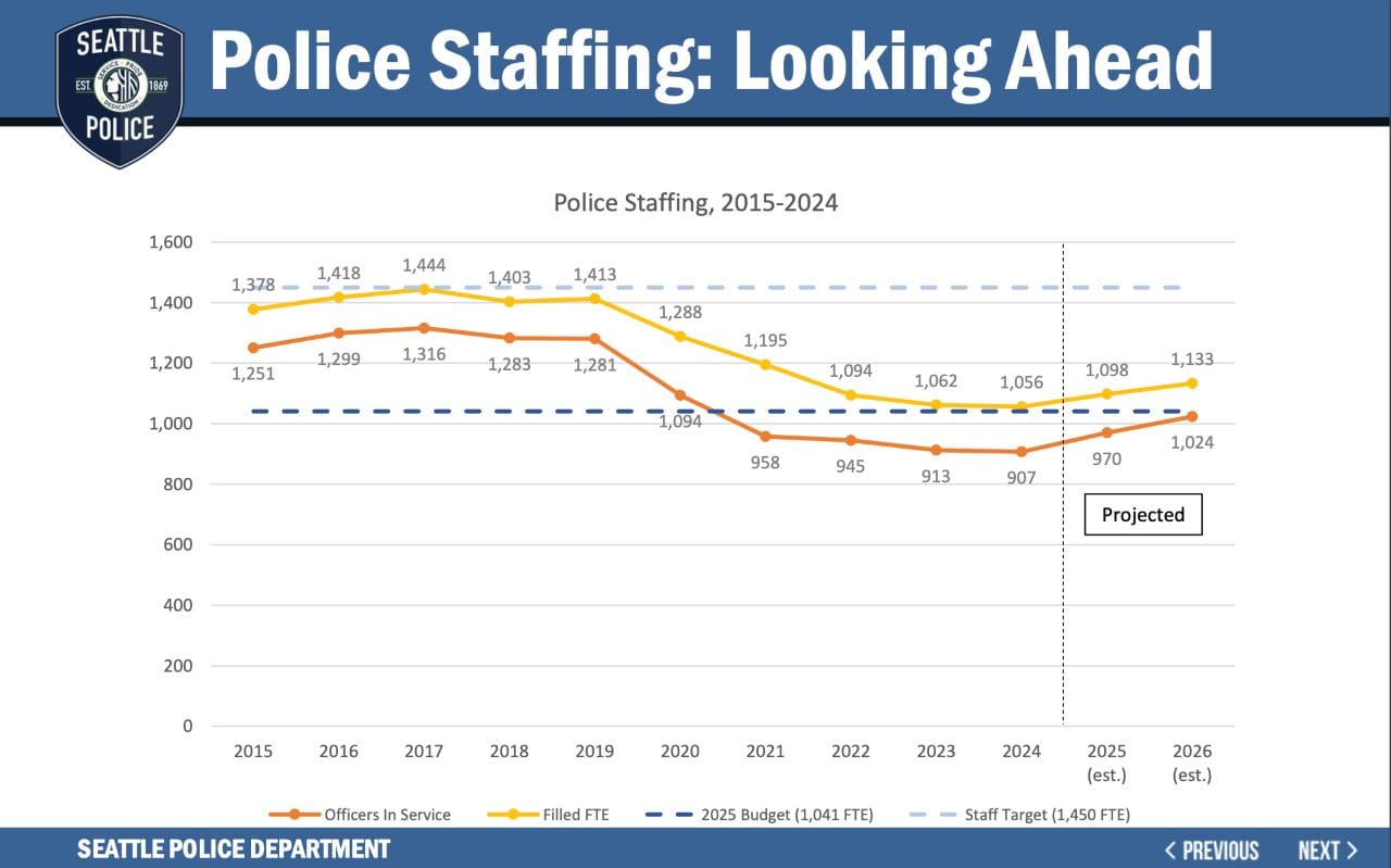 In an act of what is arguably journalistic malpractice, the Seattle Times and the major TV outlets covered this pledge as if it was feasible and reasonable, failing to highlight the key constraint – a national police officer shortage – alongside SPD’s own recruiting struggles and bottlenecks. Harrell claimed it was possible by changing the culture at SPD and making officers feel supported. But vibes are hardly a plan.