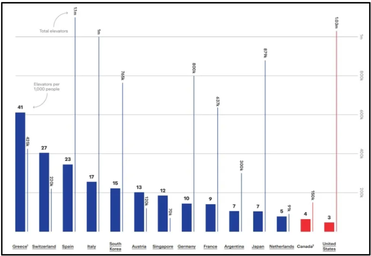 As the Center for Building in North America points out, the United States has the fewest elevators per capita of any other high-income country, with three elevators per 1,000 people. Other countries like Greece have 41 elevators per 1,000 people, Switzerland has 27 elevators per 1,000 people, and South Korea has 15 elevators per 1,000 people. This shortage of elevators is caused by codes and regulations that force elevator cars to be at least twice the size of elevator cars in Western Europe, which leads to the installation of new elevators costing at least three times as much as they cost in Western Europe and East Asia.