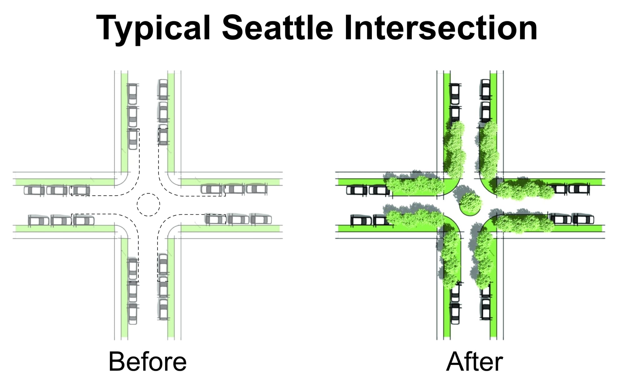 Seattle owns more than 15,000 intersections citywide, and 9,600 of them are on quiet, low-traffic streets inside our grid of neighborhoods. If we convert eight parking spaces into trees, build planted curb bulbs and roundabouts with trees, then each intersection can become 17 new trees. Doing this citywide adds nearly 165,000 trees. With a typical 16-foot diameter canopy, this would add approximately 750 acres of tree canopy in the short time it takes for these trees to mature.