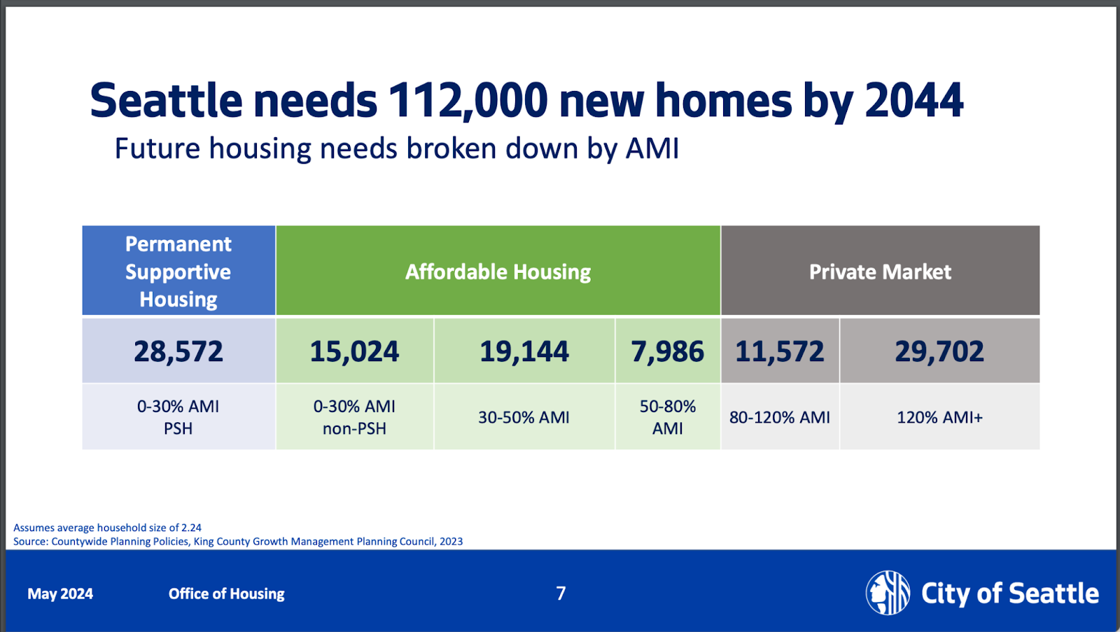 Our affordability crisis isn’t doing any better. A recent report by the Seattle Office of Housing said we’ll need 112,000 new homes by 2044, of which 25% need to be permanent supportive housing — low-income housing with wrap-around services intended for hard-to-serve homeless populations. Meanwhile, another almost 38% need to be affordable housing ranging from 0-80% area median income (AMI).