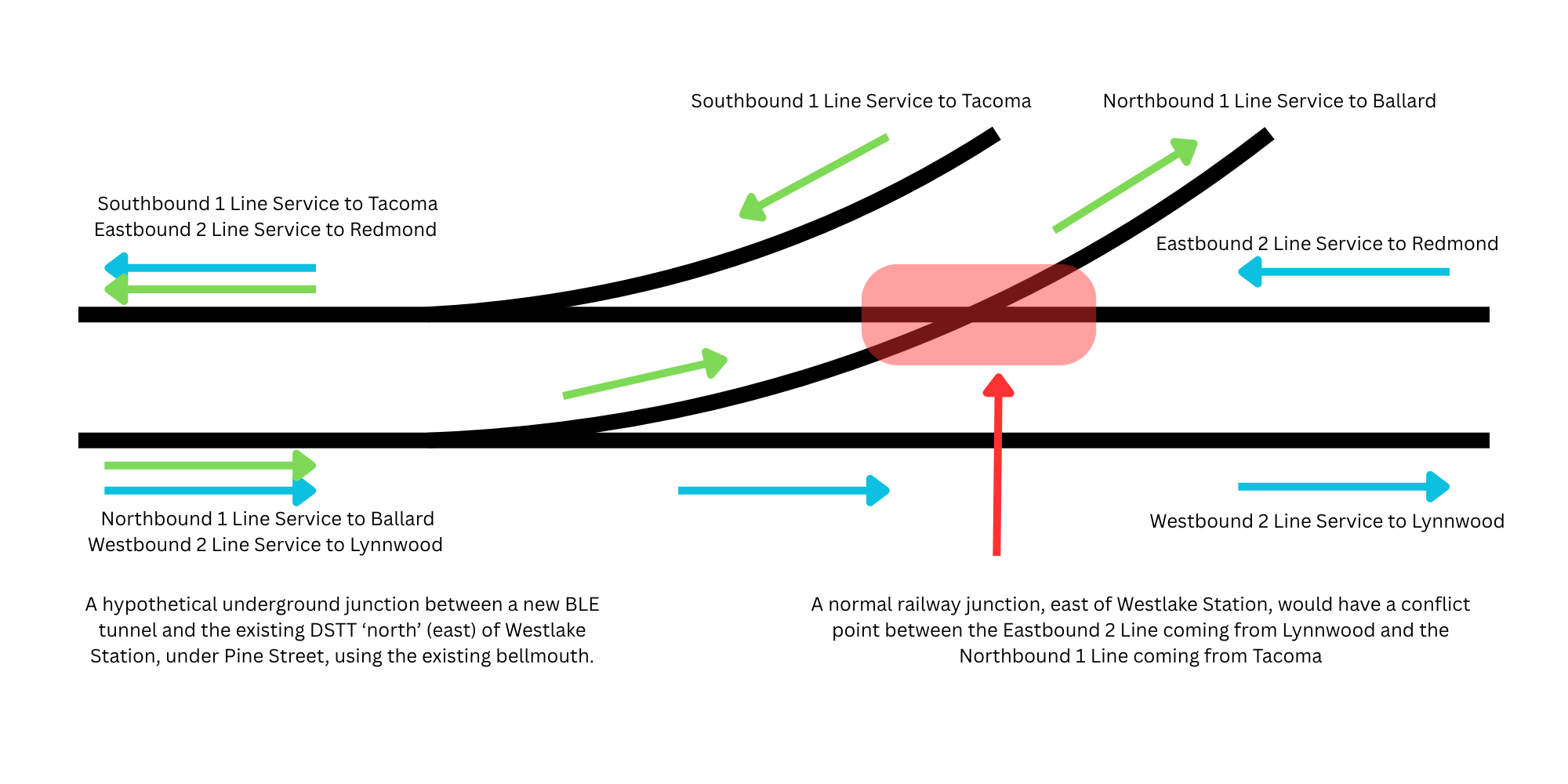 However, as previously stated, this junction would impose severe operational limitations on future Link service due to the above highlighted conflict point between trains heading in opposing directions between Ballard Link (the 1 Line) and the 2 Line entering the DSTT. Furthermore, non-flying junctions lead to operational limitations and associated challenges – 90 second headways in the DSTT would be impossible to achieve with this sort of BLE-DSTT connection. The Red-Purple Bypass Project, which was completed in 2021 in Chicago, illustrates how operational challenges can be caused by railway junctions that are not properly built as flying junctions.