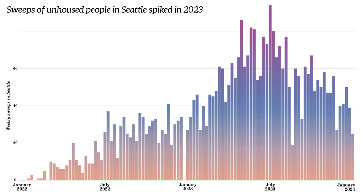 The Harrell administration has tried to make our unhoused neighbors disappear by overseeing sweeps that maximize displacement and harm to human life. The Seattle Unified Cares Team, performed more than 2,200 sweeps annually in 2023, even during brutal inclement weather events, despite community outcry. Between 2023 and 2024, this program came at a price tag of approximately $52.5 million.