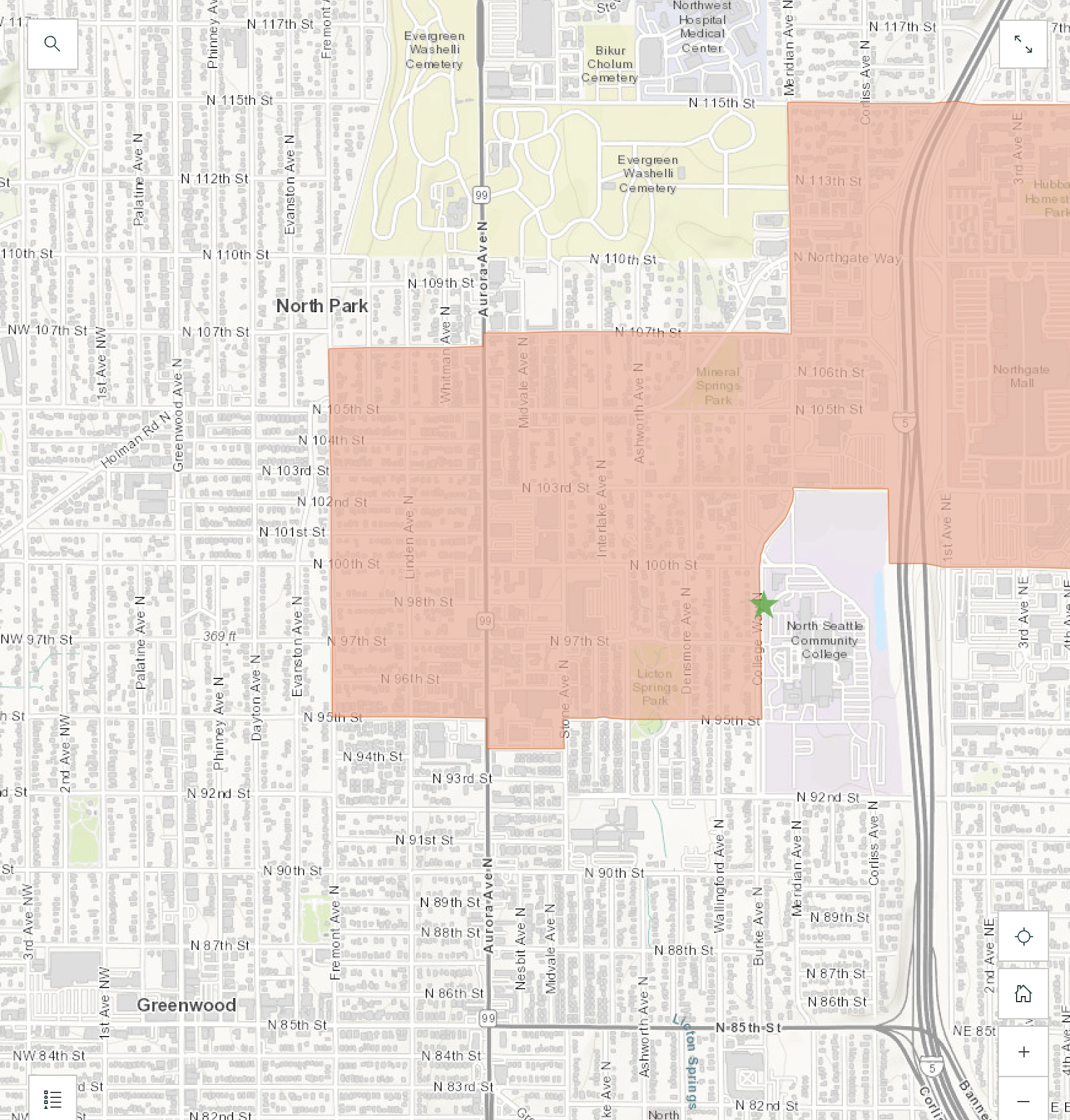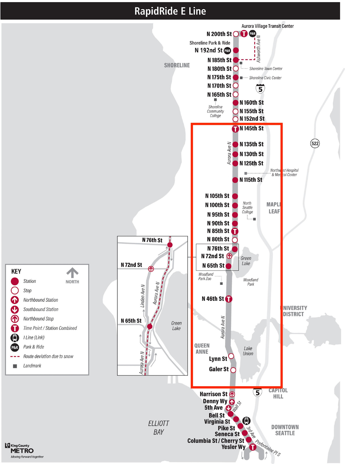 South of Green Lake along Aurora Avenue N is a transit desert in a growing, increasingly residential part of the city. While the E Line has 14 stops north of N 65th Street, only three stops serve a long distance before reaching Roy Street. That arrangement skips over entire neighborhoods.