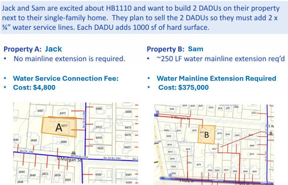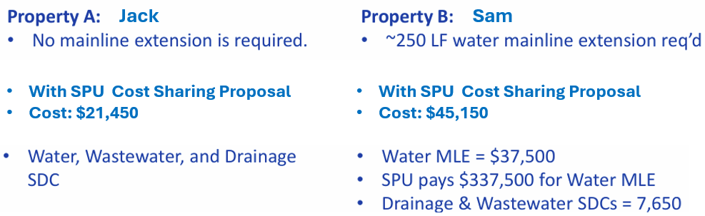 A water main exists in front of Jack’s Lot A, and he can obtain water service to support construction. However, Sam on Lot B is not so fortunate. They must pay for and install an eight-inch-diameter water main extension, at an estimated cost of $375,000. Sam’s requirement to achieve the same outcome is incredibly disproportional to Jack’s, and demonstrates the inequity of SPU’s current water main policies.