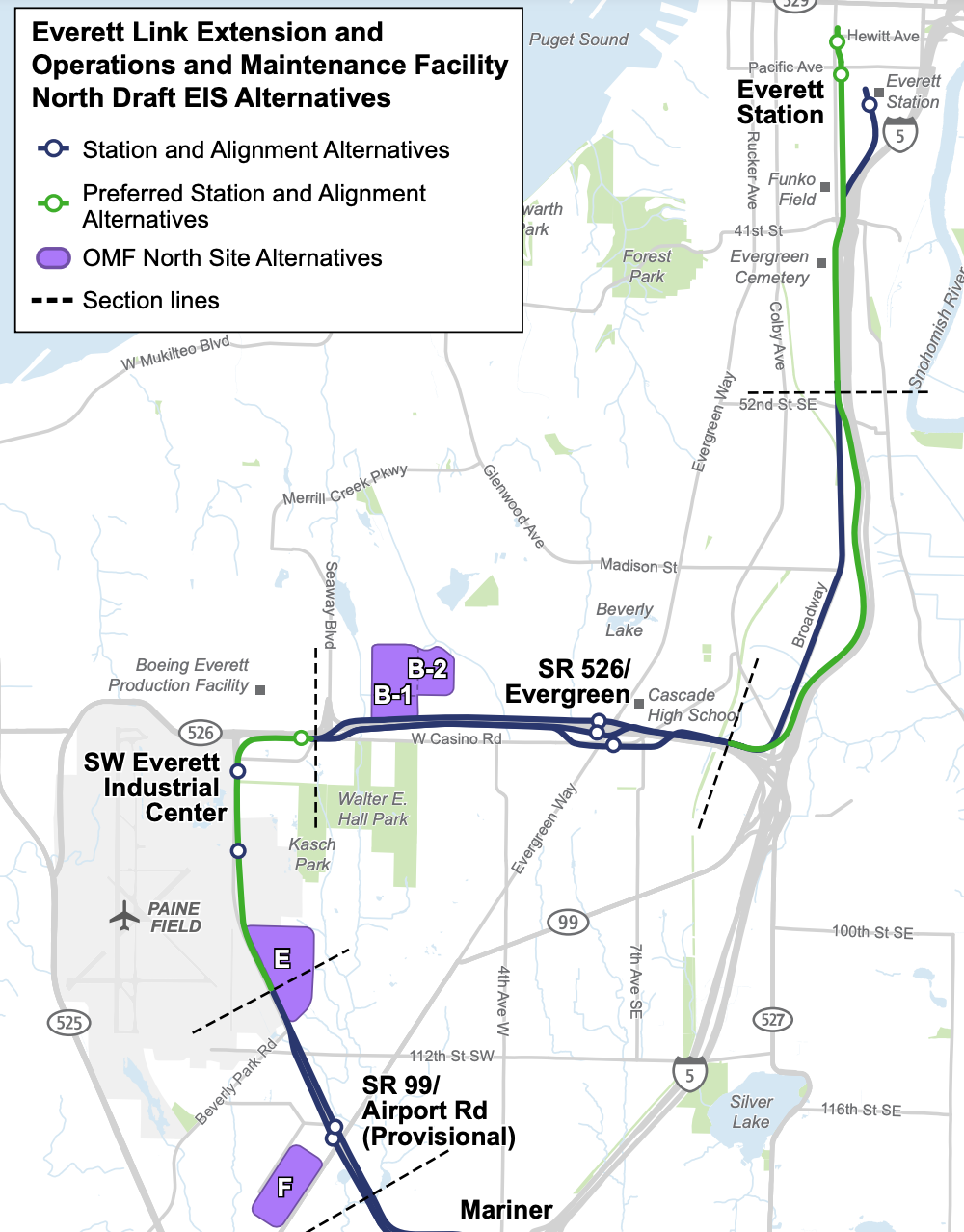 The preferred alternative for the Everett Link Extension will displace hundreds of low-income residents and jobs, and comes with a high cost premium over simply locating elevated alignments and stations within streets like SkyTrain in Vancouver, British Columbia. Also worrying is that the deviation through Paine Field won’t directly serve the airport and ridership will largely be poached from existing bus service, providing little overall transit benefit, especially compared to a more complementary routing. An alignment could be placed on SR 99/Evergreen Way with several stations between Airport Road and SR 526 would generate much more ridership and do it at far lower cost.
