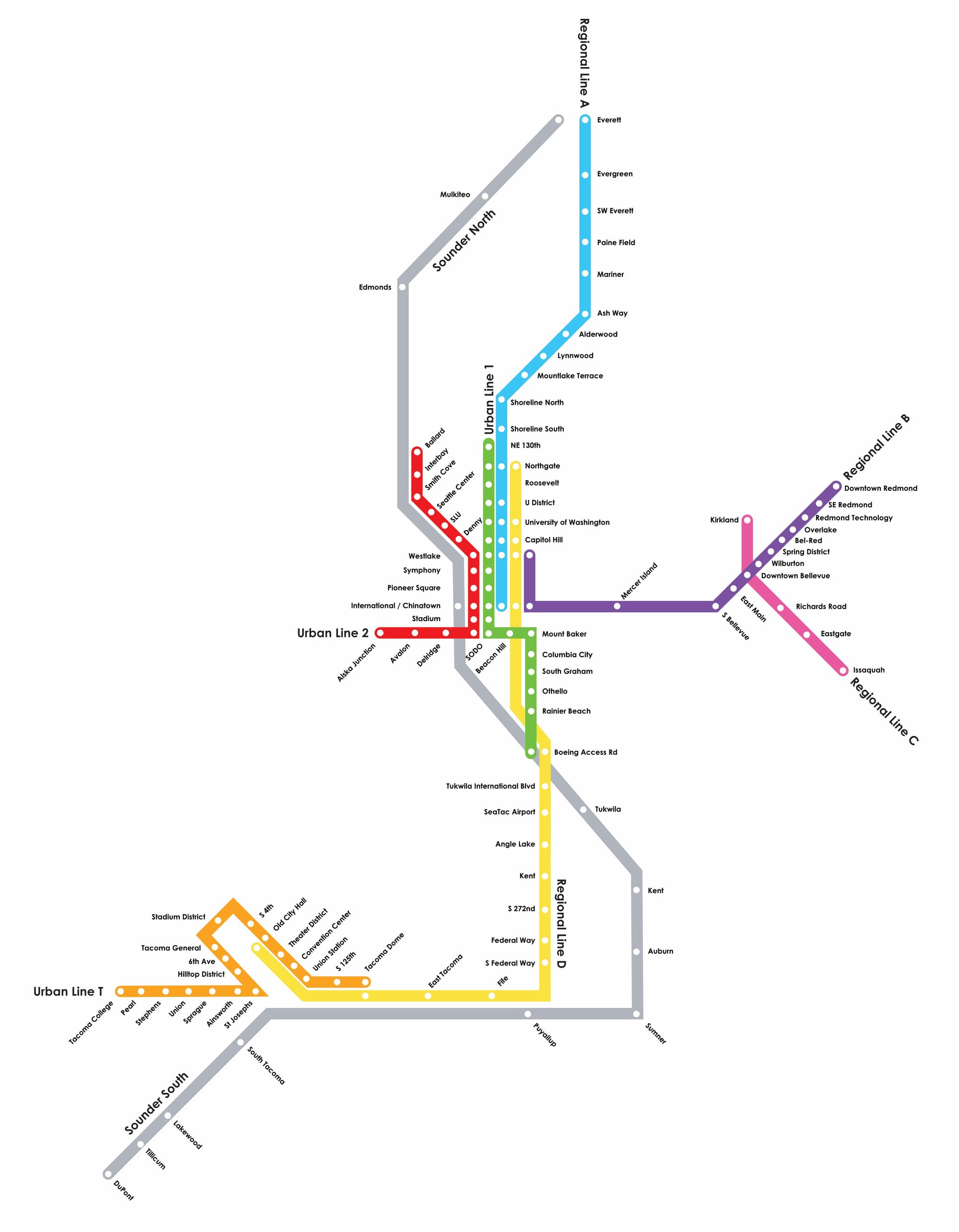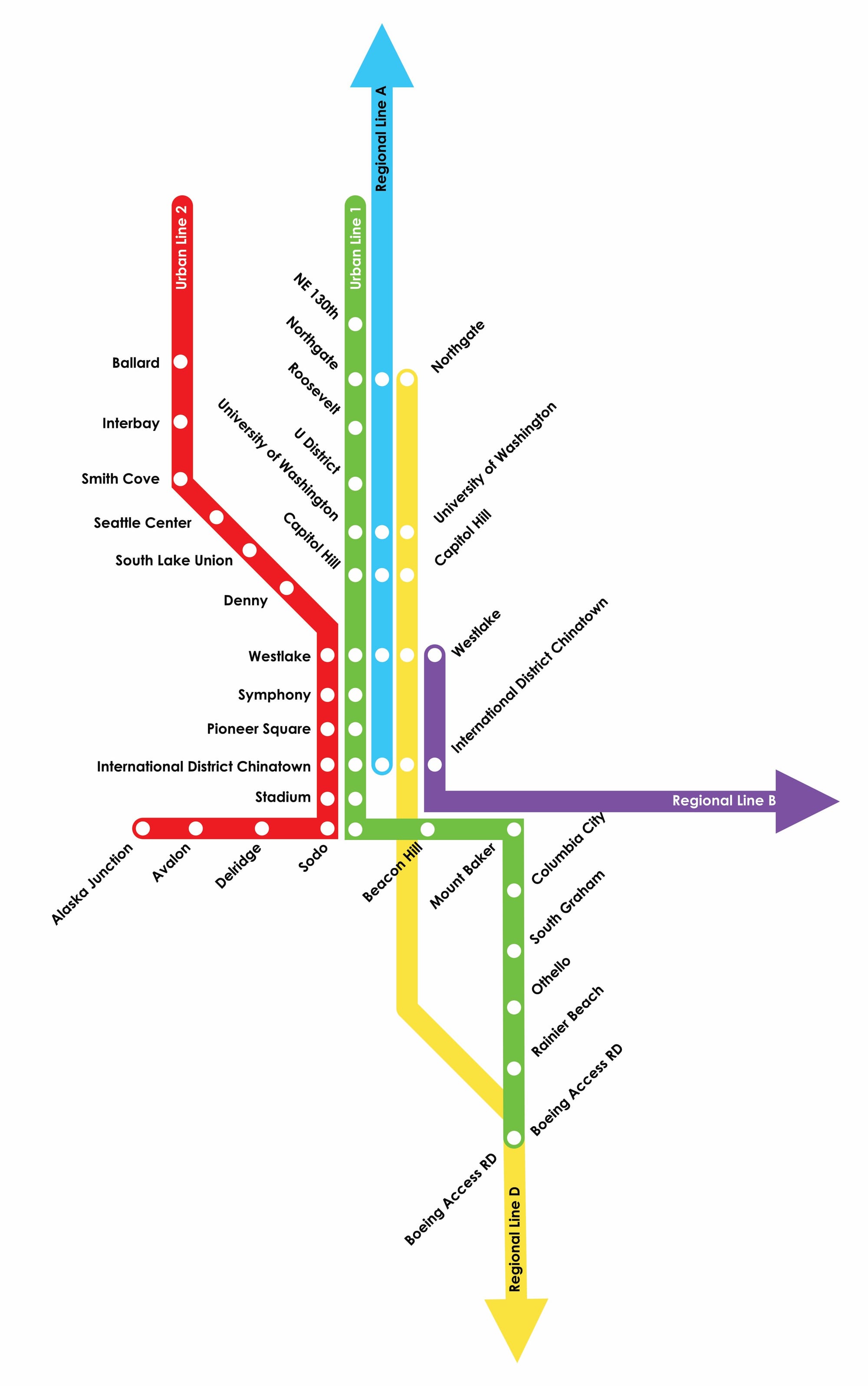 Another use of a bypass track can speed up the Regional Line traveling north to Everett skipping a few north Seattle urban stops and giving the urban line a chance to branch off for future expansions in different directions. This flexibility allows the urban system to grow organically as our city urbanizes.