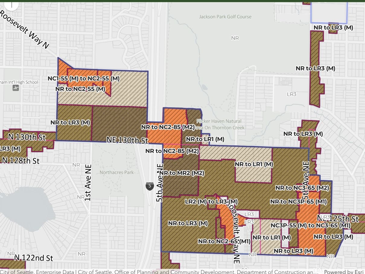 Pinehurst, meanwhile, is an entirely new urban center being added around Seattle’s soon-to-open infill light rail station at N 130th Street, which will be a stop for both the 1 Line and 2 Line. The presence of Jackson Park Golf Course next door to the station makes this an oddly shaped center.