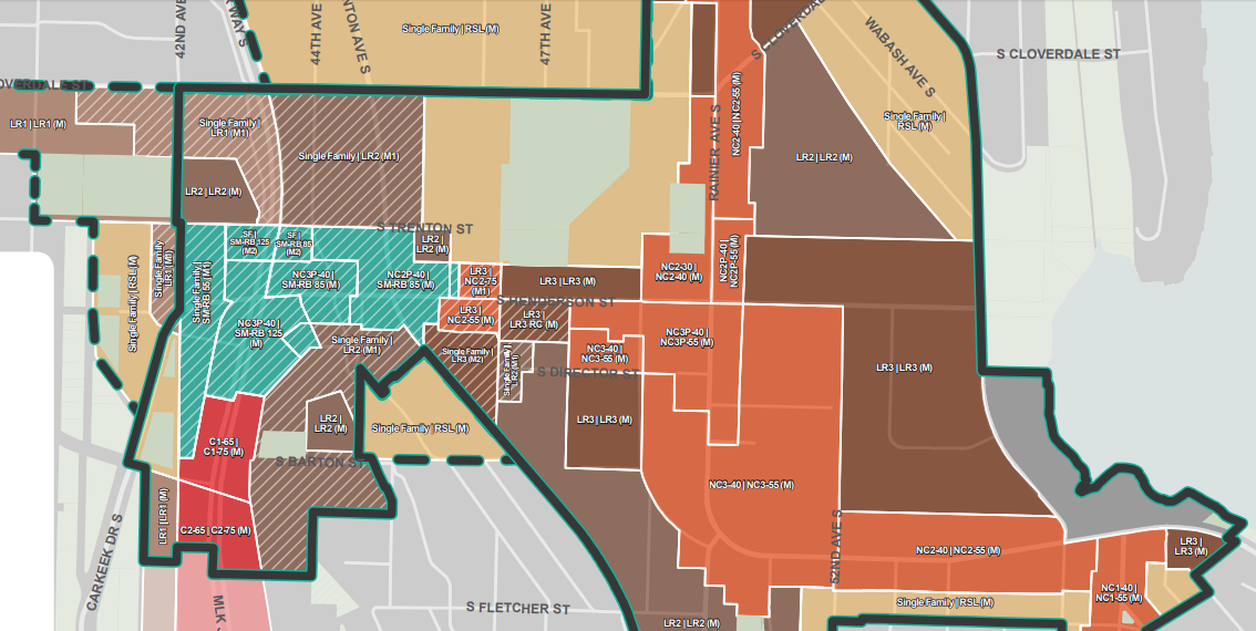 The highest zones will be in First Hill with Highrise 440-foot zoning, followed by Northgate, which is slotted to get some 240-foot zoning near its future light rail station. Low displacement risk neighborhoods like Wallingford generally see heightened upzones over high displacement risk neighborhoods like Rainier Beach, Othello, and Columbia City, the last of which is also a high opportunity area. See the preferred zoning maps below: