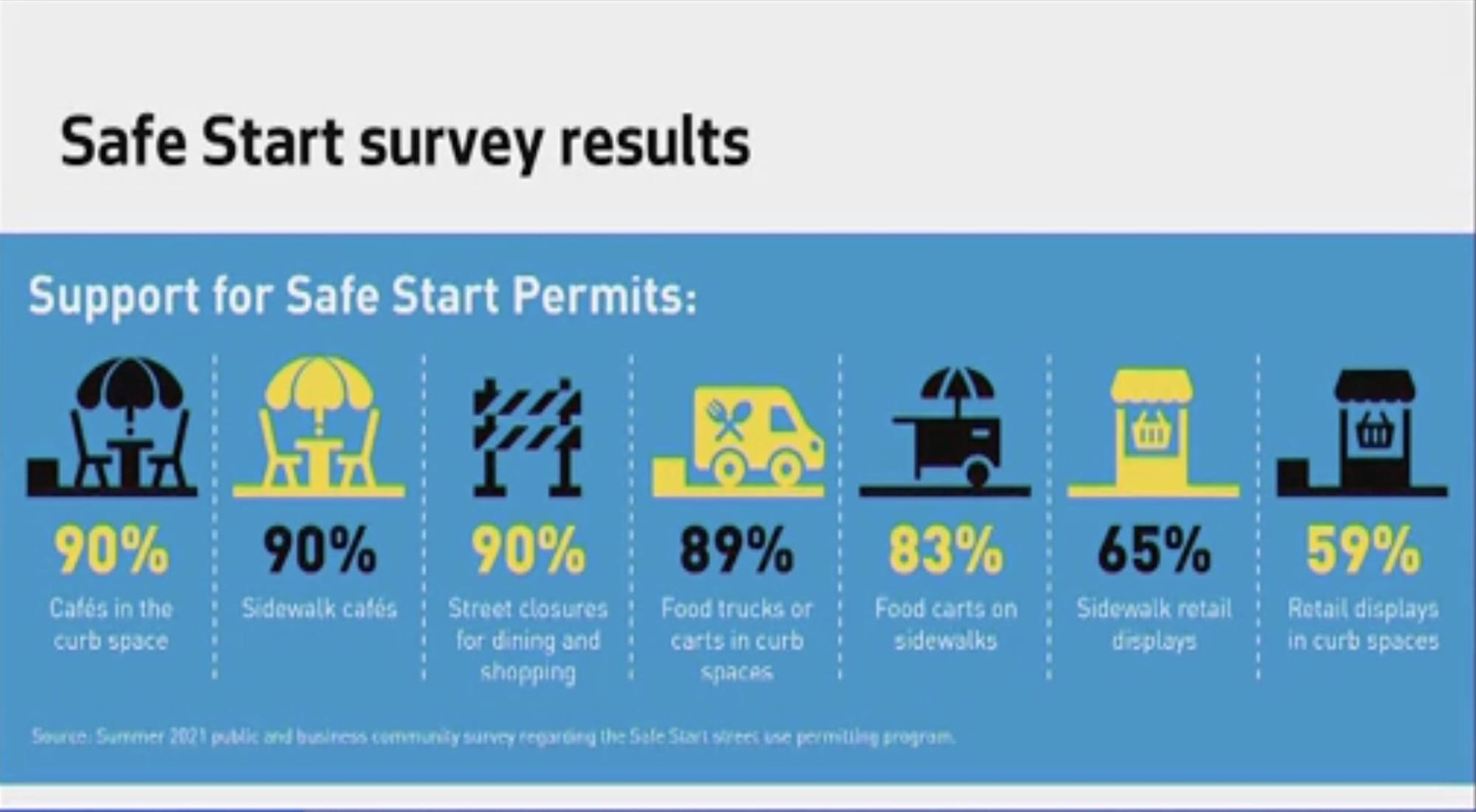 While there appeared to be general consensus around extending the current permits through January 2023, two issues arose from councilmembers looking forward to a permanent program. Councilmember Lisa Herbold (District 1) raised concerns about accessibility for everyone using the street. She requested SDOT consider actually testing some sites for accessibility, pointing to an example from New York.