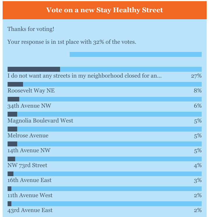 On Wednesday, The Seattle Times published a story on plans to expand the Stay Healthy Streets program that included an online poll to guage the popularity of new additions. A whopping 73% of respondents supported adding Stay Healthy Streets over “I don’t want any streets in my neighborhood closed…”