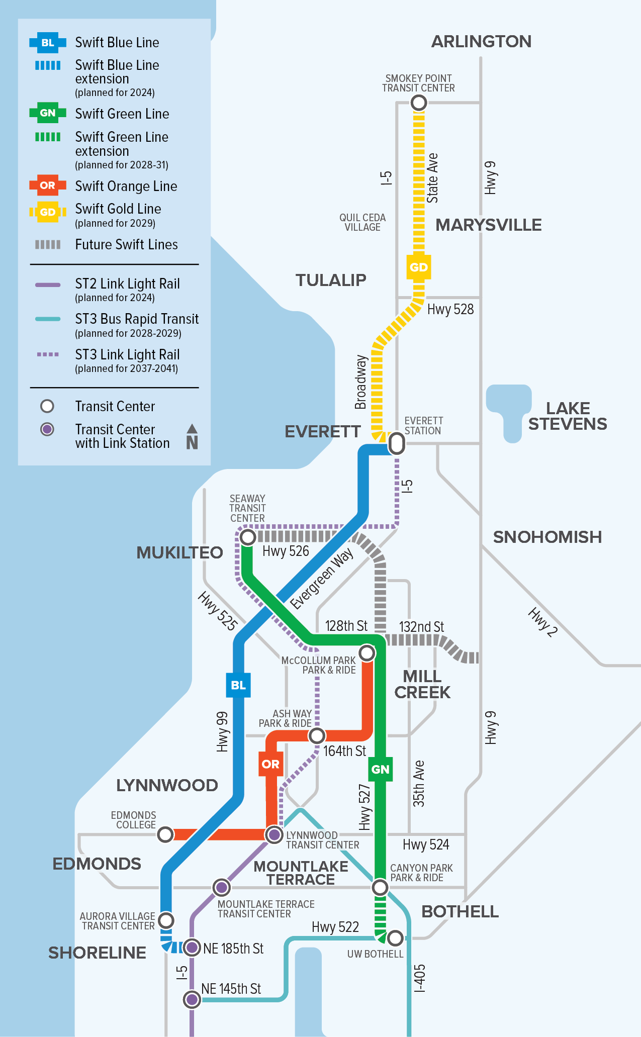 In addition, the Swift Blue Line, in time for the August opening of the Lynnwood extension of Sound Transit’s 1 Line, will get an extension along Meridian Avenue and 185th to connect it with the new Shoreline North/185th Link station. Simmons says Community Transit is also looking to extend the Swift Green Line to downtown Bothell and UW Bothell/Cascadia College, as well as a link to Sound Transit’s Stride S3 BRT line. That’s expected sometime late in this decade, as early as 2028.