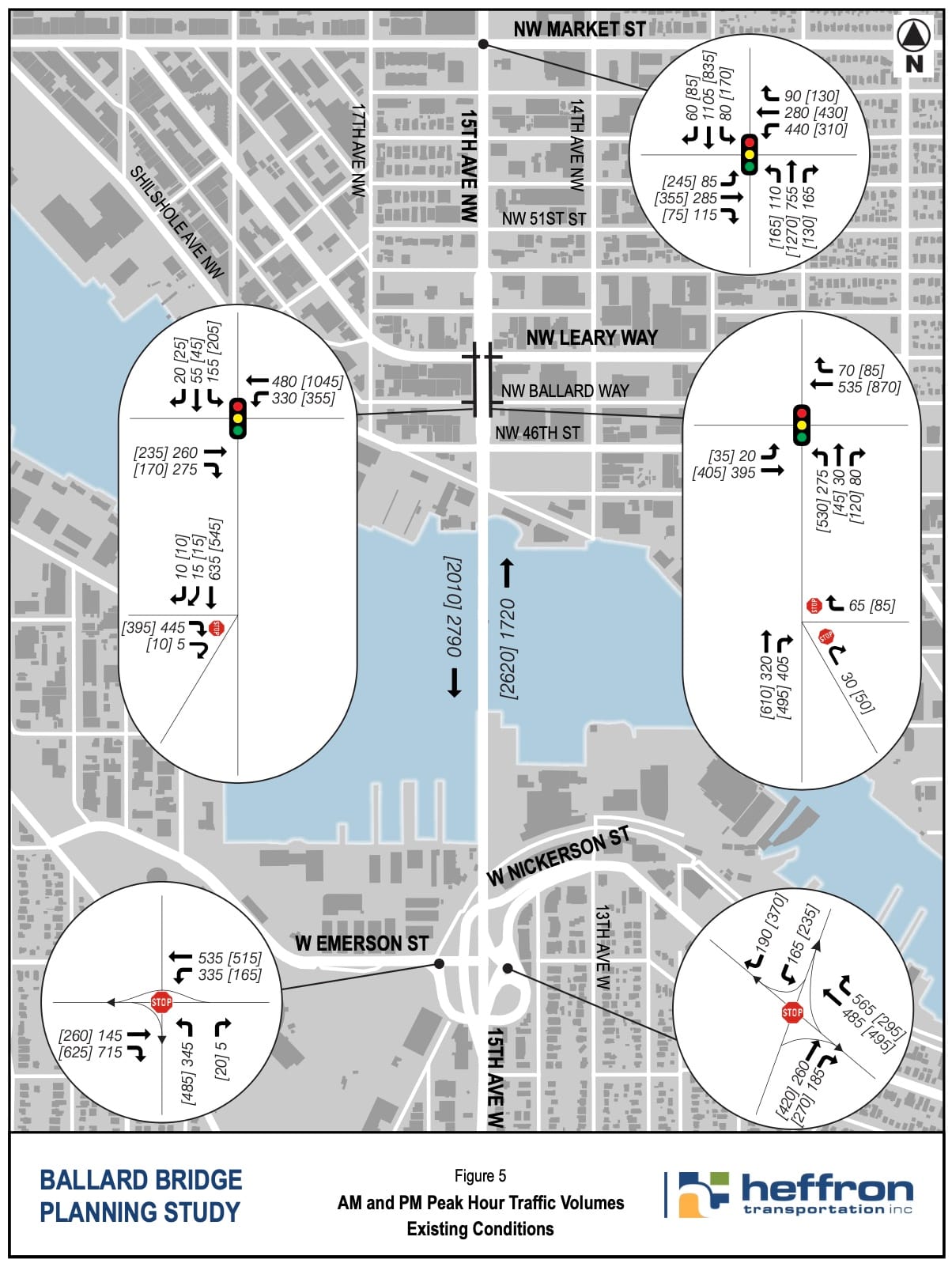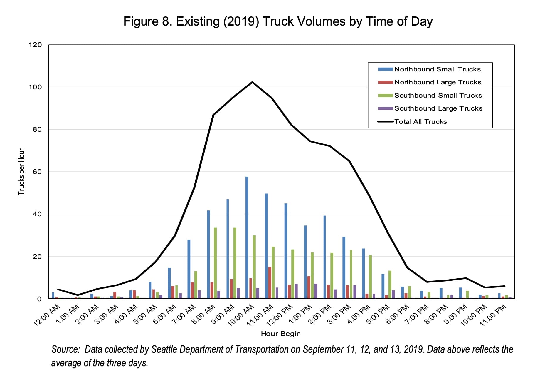 The Ballard Bridge Study is an excellent example. Traffic engineers measured the level of service at certain intersections north and south of the bridge. The studies suggest that the roads need to be bigger in order to allow vehicles to flow more freely through the intersections. Those measurements were done during the morning rush hour and the evening rush hour. Peak travel for freight traffic over Ballard Bridge is just before noon, sliding right between the two peaks. None of the level of service tests are about freight.
