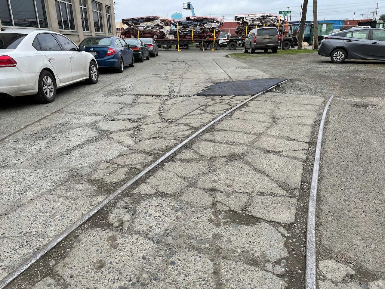 For the many public industrial streets that intersect arterials, shoulder paint and lane stripes last a few dozen feet. Complete curbs and sidewalks, less so. The industrial streets loop and connect along the curves of the river. Every connection is a different type of road surface. A grid of old railroad tracks crosses the industrial area. Where they meet a street is almost always a gully filled with water and more cracked asphalt.
