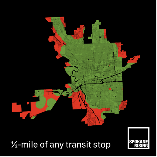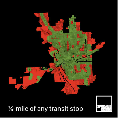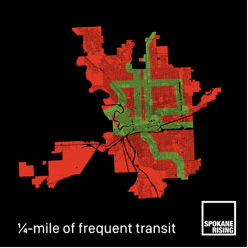 In some ways, this goes further than Seattle has gone; there, off-street parking is generally required except within a 1/4-mile of frequent transit or in an urban center. Here’s how the map might look if Spokane were to use an alternative radius in its legislation: