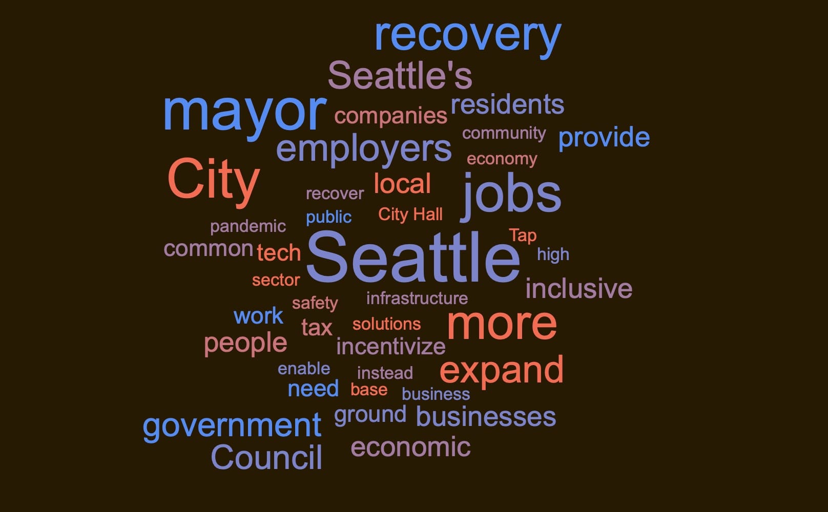 If we look at the top 40 words Pedersen used in his 1000 word article, race doesn’t even make the list. Chamber interests like business, companies, and employers dominate. The counclmember appears to have lived through the 2010s and is headed straight back to 1980’s Reaganomics.